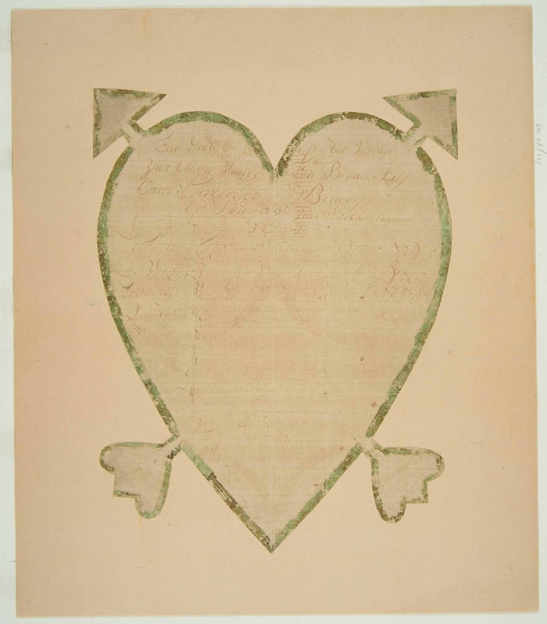 - Verjaardagsgedicht voor Carel Frederik Bendorp, geschreven door Elisabeth de Haas op in de vorm van een door twee pijlen doorboord hart geknipt papier met een goud-groene rand op 19 februari 1758.