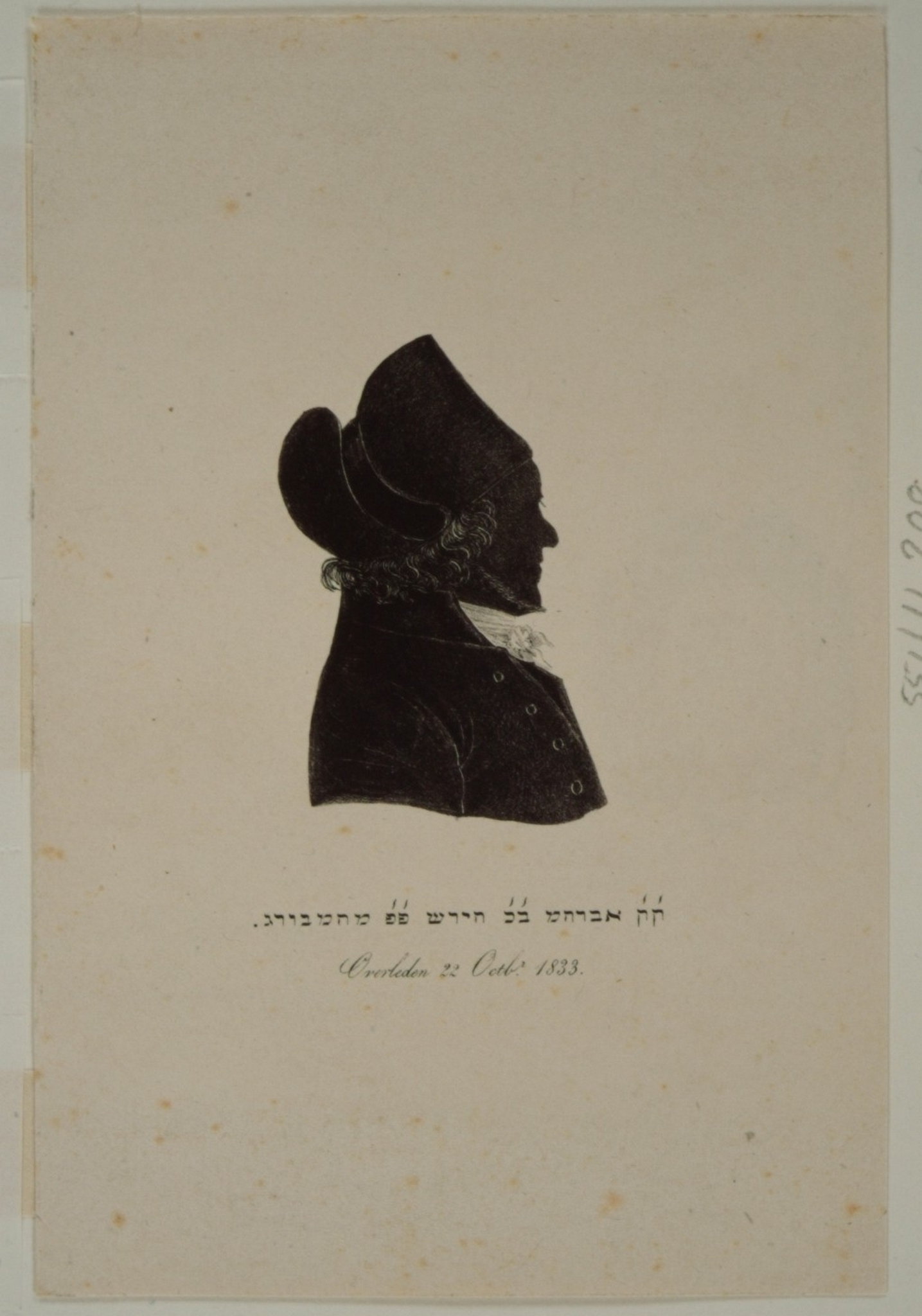 hxb: 9,3 x 5,9 cm. Geboren in Hamburg 1749 of '50 en overleden in Dordrecht 1833. Zanger in de synagoge van de Israëlitische gemeente te Dordrecht