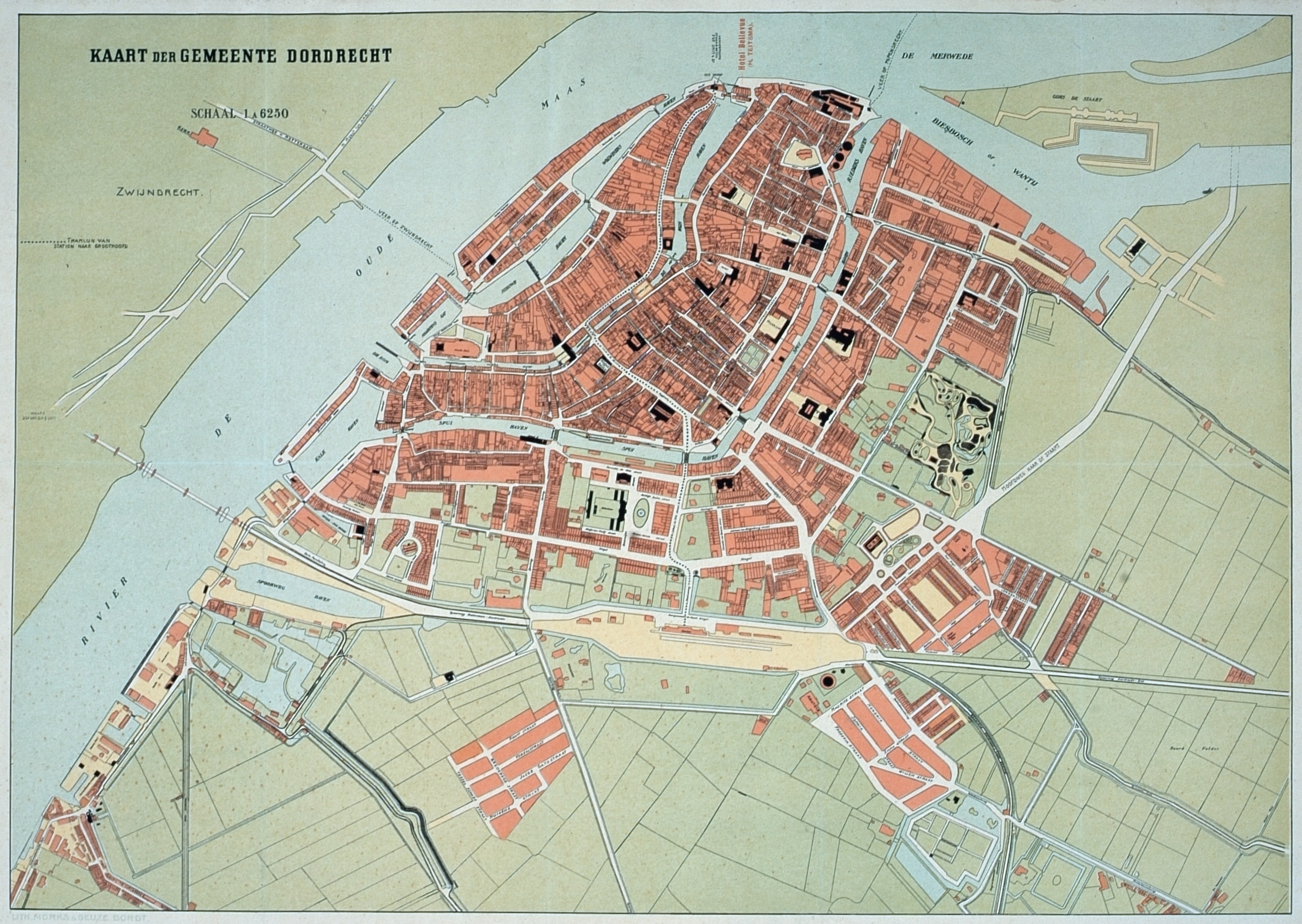 - hxb: 36 x 50,4 cm. Schaal: 1 : 6250. Uit: Gids voor Dordrecht, uitgegeven met medewerking van de Vereeniging tot bevordering van de bloei van Dordrecht en omstreken (VVV). De in aanleg zijnde Oranjelaan, met Prins Hendrikbrug en terreinen op de Staart (feestelijk in gebruik genomen op 12 februari 1910) zijn reeds aangegeven.