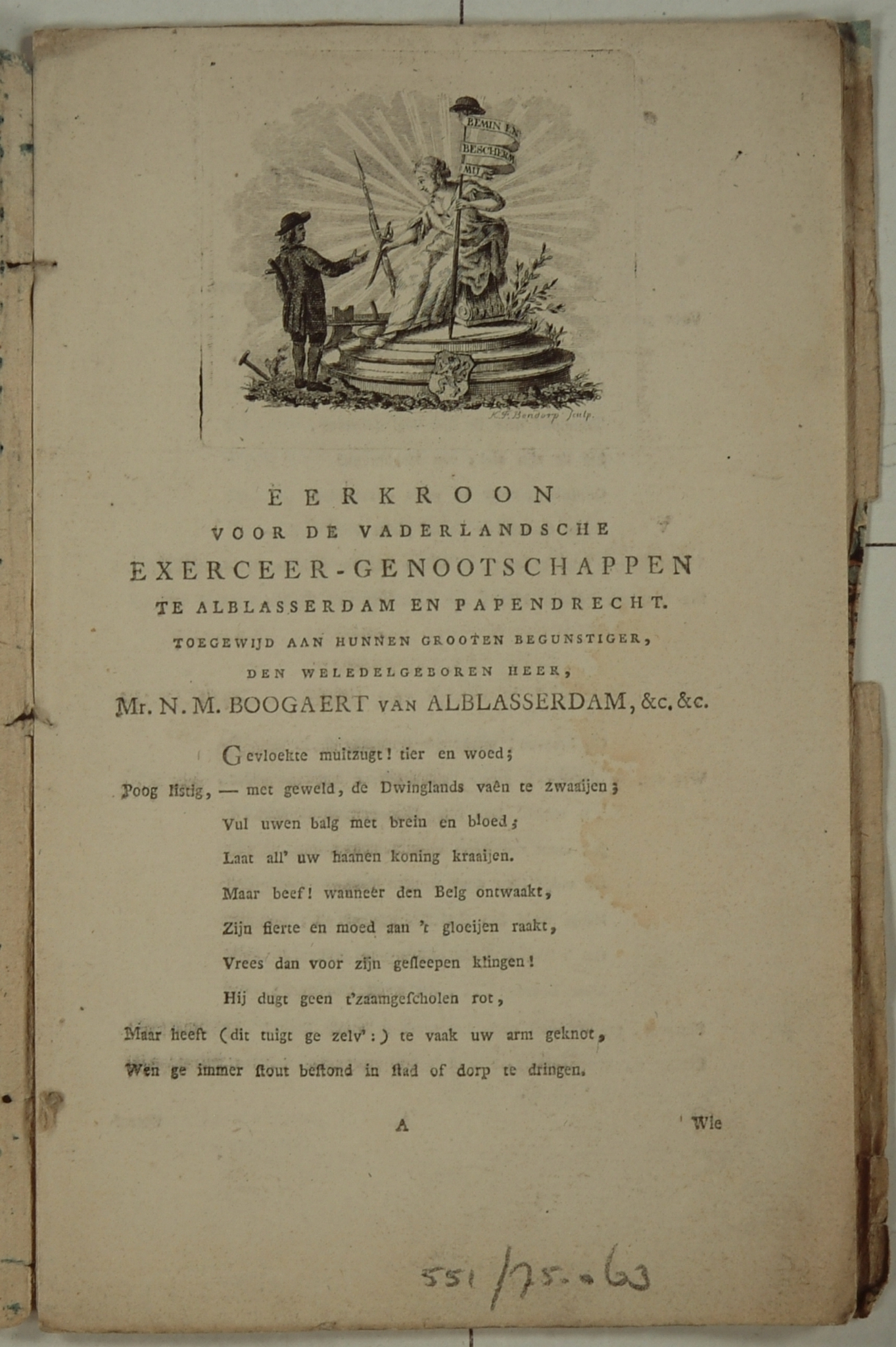- hxb: 6,5 x 7 cm. In: Eerkroon voor de Vaderlandsche Exerceergenootschappen te Alblasserdam en Papendrecht toegewijd aan hunnen grooten begunstiger den WelEdelgeboren Heer Mr. N. M. Boogaert van Alblasserdam etc. Gedicht in vijf 10-regelige coupletten door S. van de Graaf. Alblasserdam 7 aug. 1784. 3 blz.