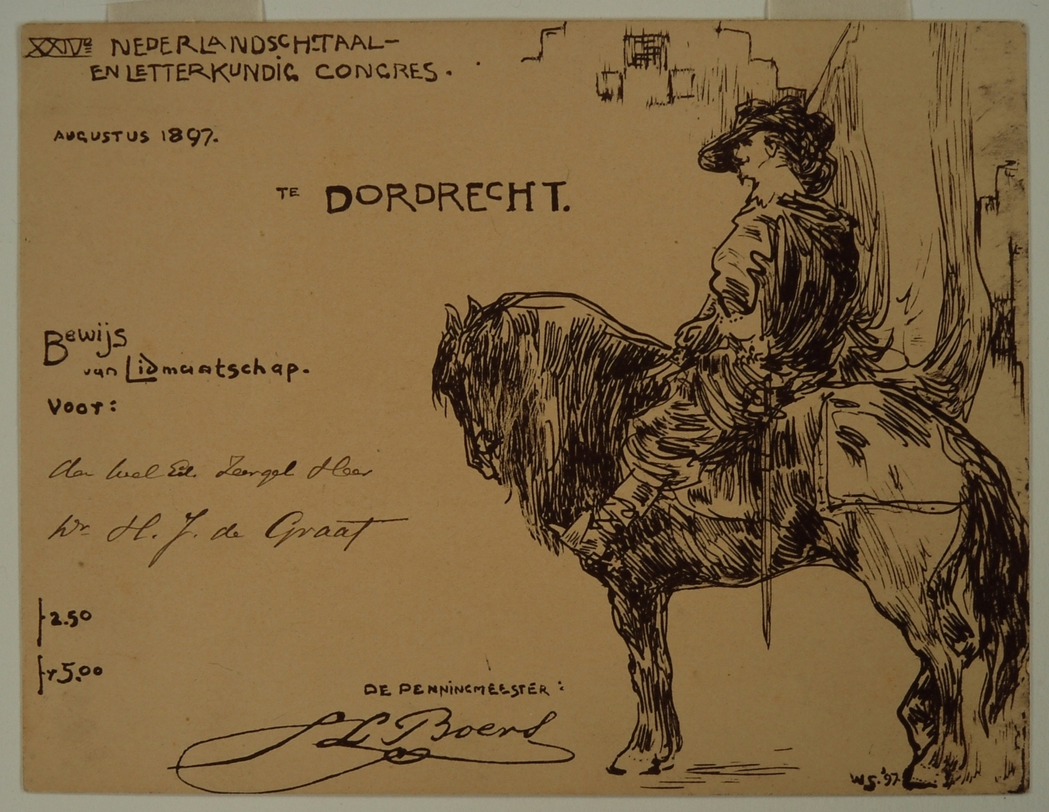 Bewijs van lidmaatschap voor H.J. de Graaf ter gelegenheid van het 24e Nederlandse Taal- en Letterkundig Congres in Dordrecht