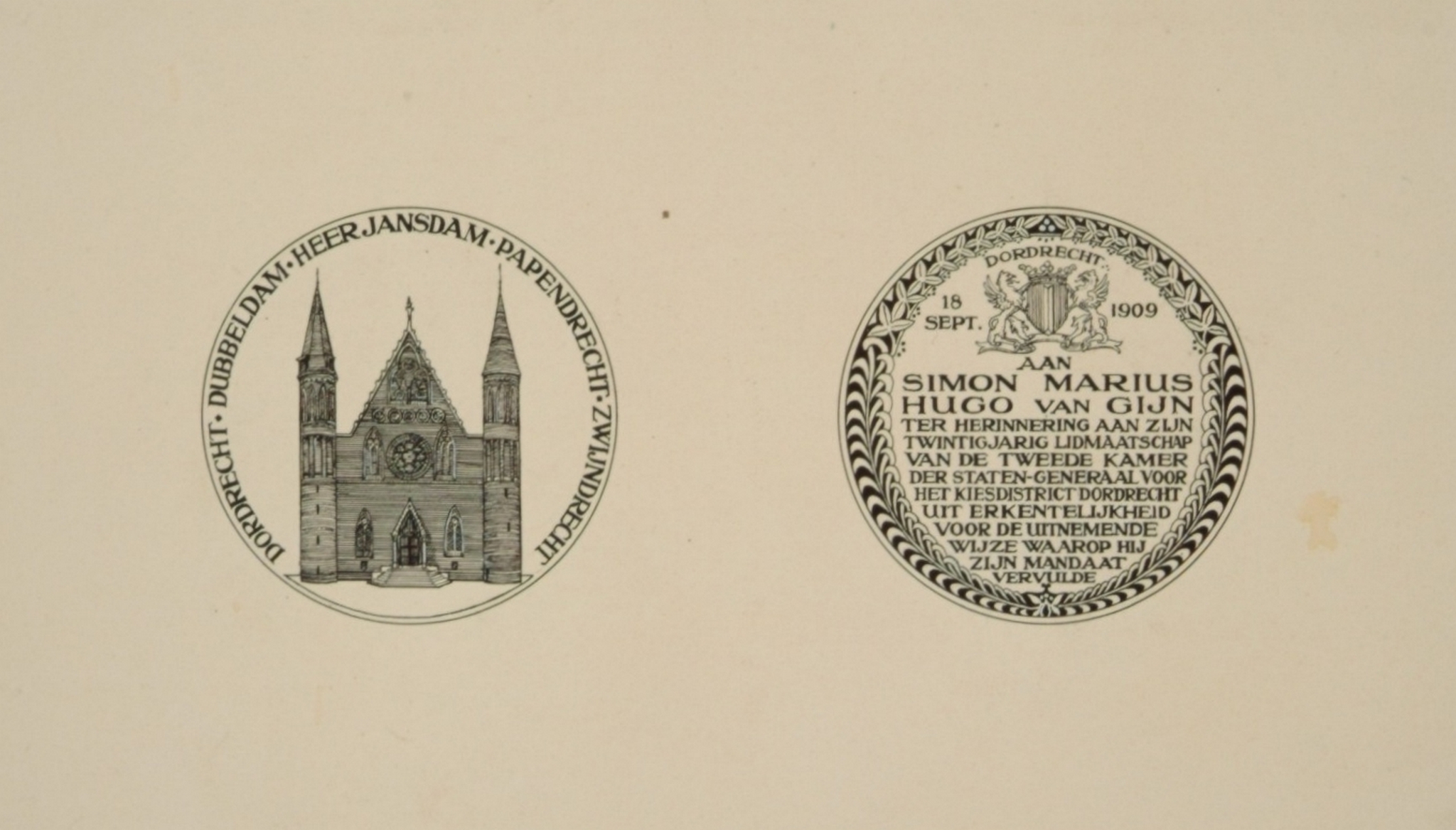 - Gouden gedenkpenning, aangeboden aan S.M. Hugo van Gijn door vrijzinnige kiezers uit het kiesdistrict Dordrecht, ter gelegenheid van zijn aftreding als Lid van de Tweede Kamer op 18 september 1909. Op de voorzijde het Binnenhof in Den Haag. Op de achterzijde het Dordtse wapen en een inscriptie