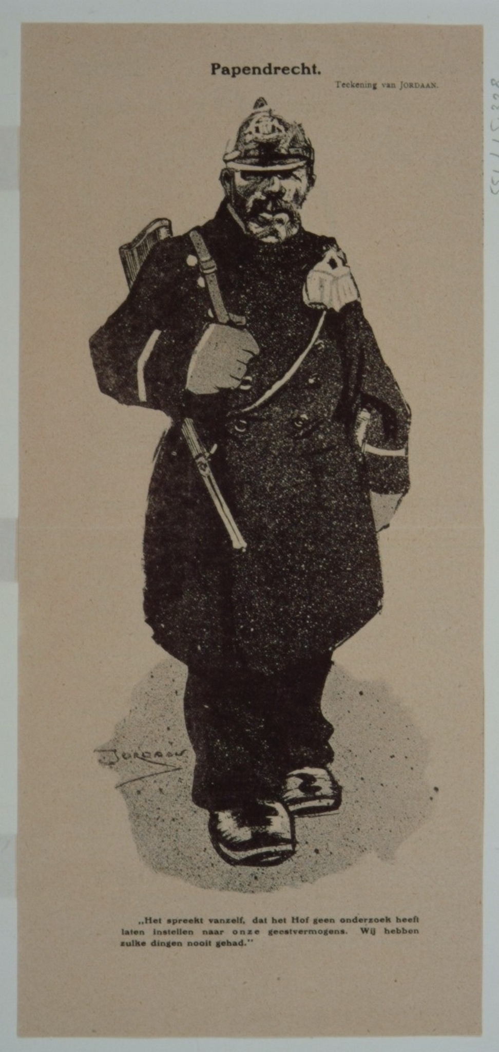 Spotprent op de behandeling van de zaak Garsthagen, de zogenaamde Papendrechtse Strafzaak, voor het Hof te Arnhem van 8-14 november 1910 en het psychiatrisch rapport door geneeskundigen uitgebracht over de geestvermogens der betrokken personen en getuigen a décharge, doch niet over die der betrokken rijksveldwachters; afbeelding van een rijksveldwachter met bruut gezicht, met onderschrift: "Het spreekt vanzelf, dat het Hof geen onderzoek heeft laten instellen naar onze geestvermogens. Wij hebben zulke dingen nooit gehad."