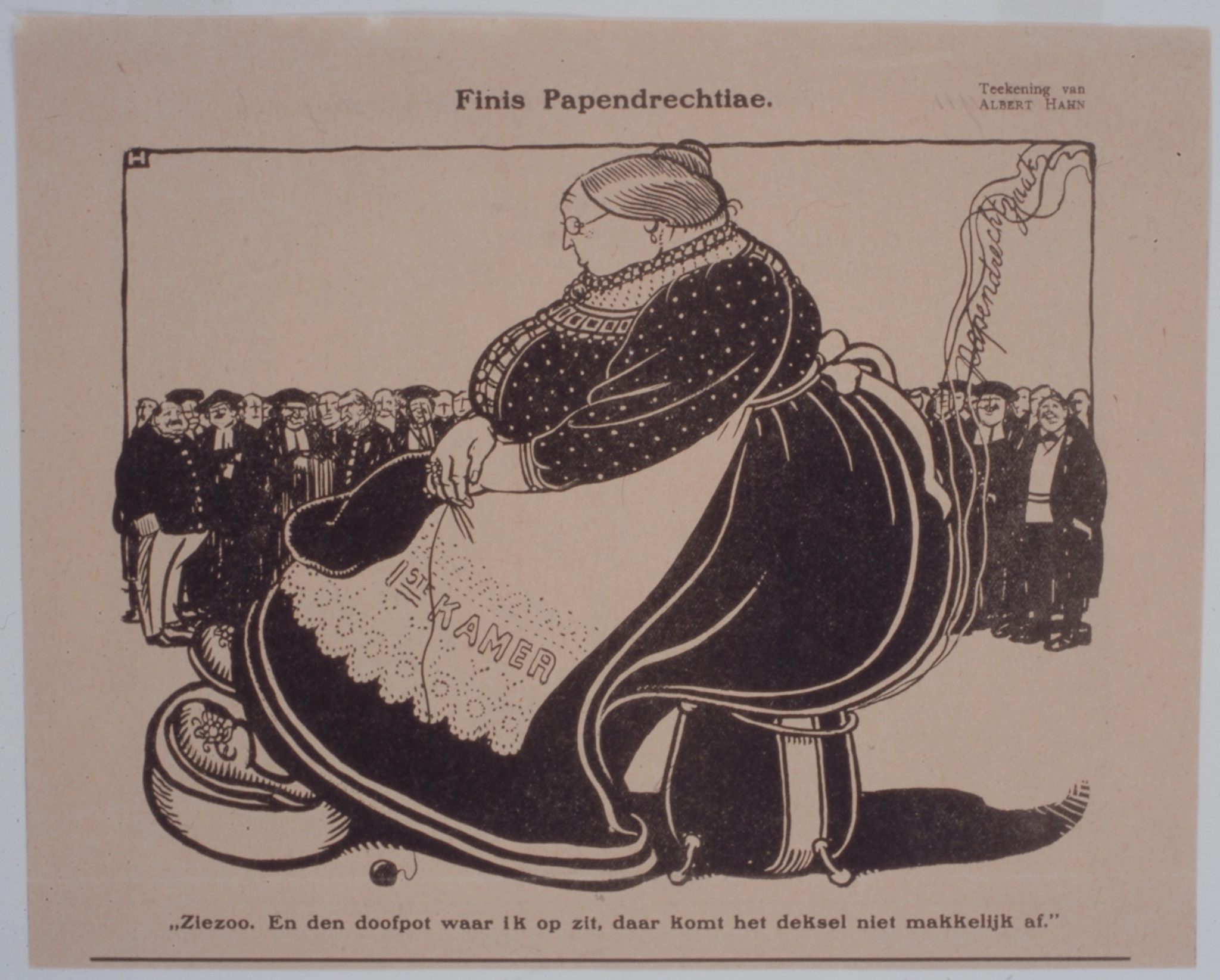 - 'Finis Papendrechtiae. Spotprent op de afhandeling van de zaak Garsthagen, de Papendrechtse strafzaak. De Eerste Kamer wordt afgebeeld als bejaarde vrouw, zittend op een geopende doofpot. Op de achtergrond zijn ministers en rechterlijke ambtenaren.