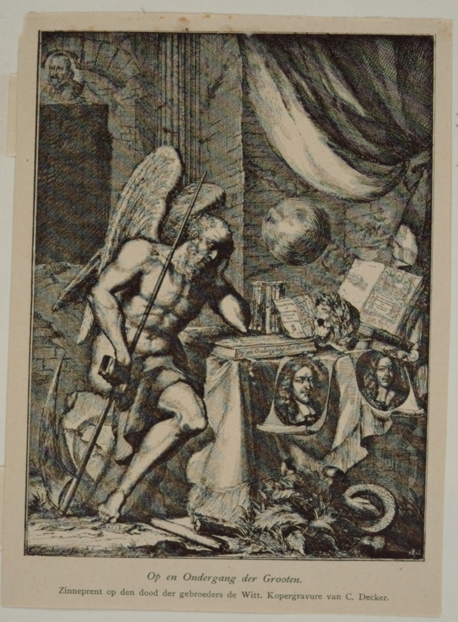 - Zinneprent ter ere van de gebroeders De Witt. De afbeelding toont de Tijd treurend over het lot van de De Witten. Saturnus zit aan een tafel, waarop een gelauwerd doodshoofd en Vondels Palamedes staat. Zelf leunt hij op het boek 'Op- en ondergang der Groten'.