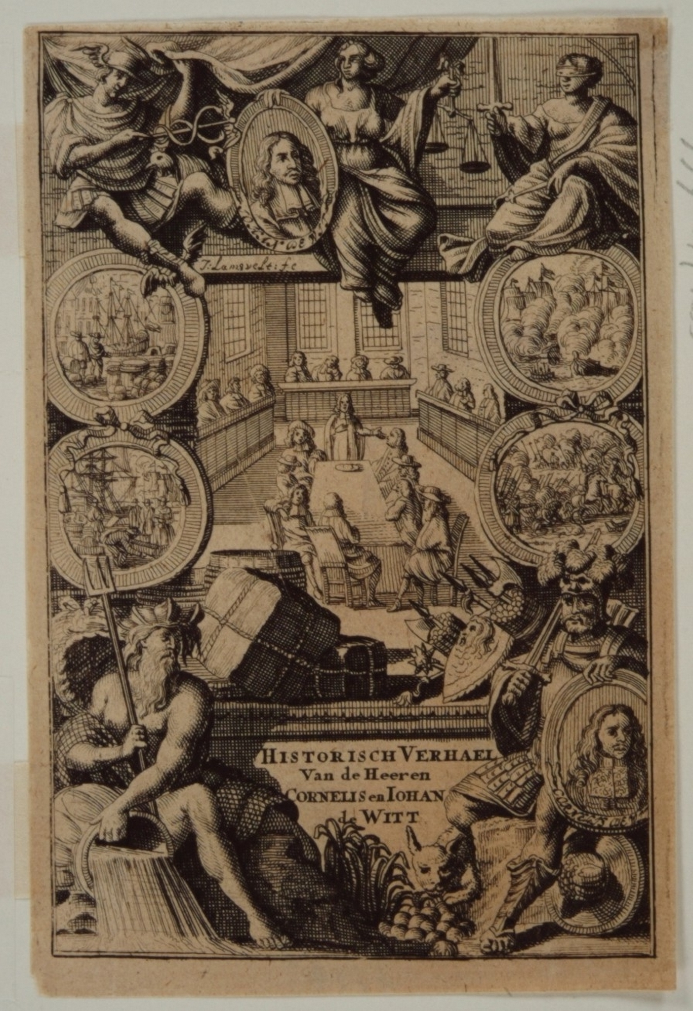 - Zinneprent ter ere van de gebroeders De Witt. De afbeelding toont in het midden Johan de Witt, die het woord voert in een raadzaal. Boven in de omlijsting is vrouwe Justitia te zien die zijn portret vasthoudt; aan weerszijden zijn medaillons met zeegevechten te zien. Aan de onderzijde is Mars verbeeldt, die het portret van Cornelis de Witt vasthoudt.