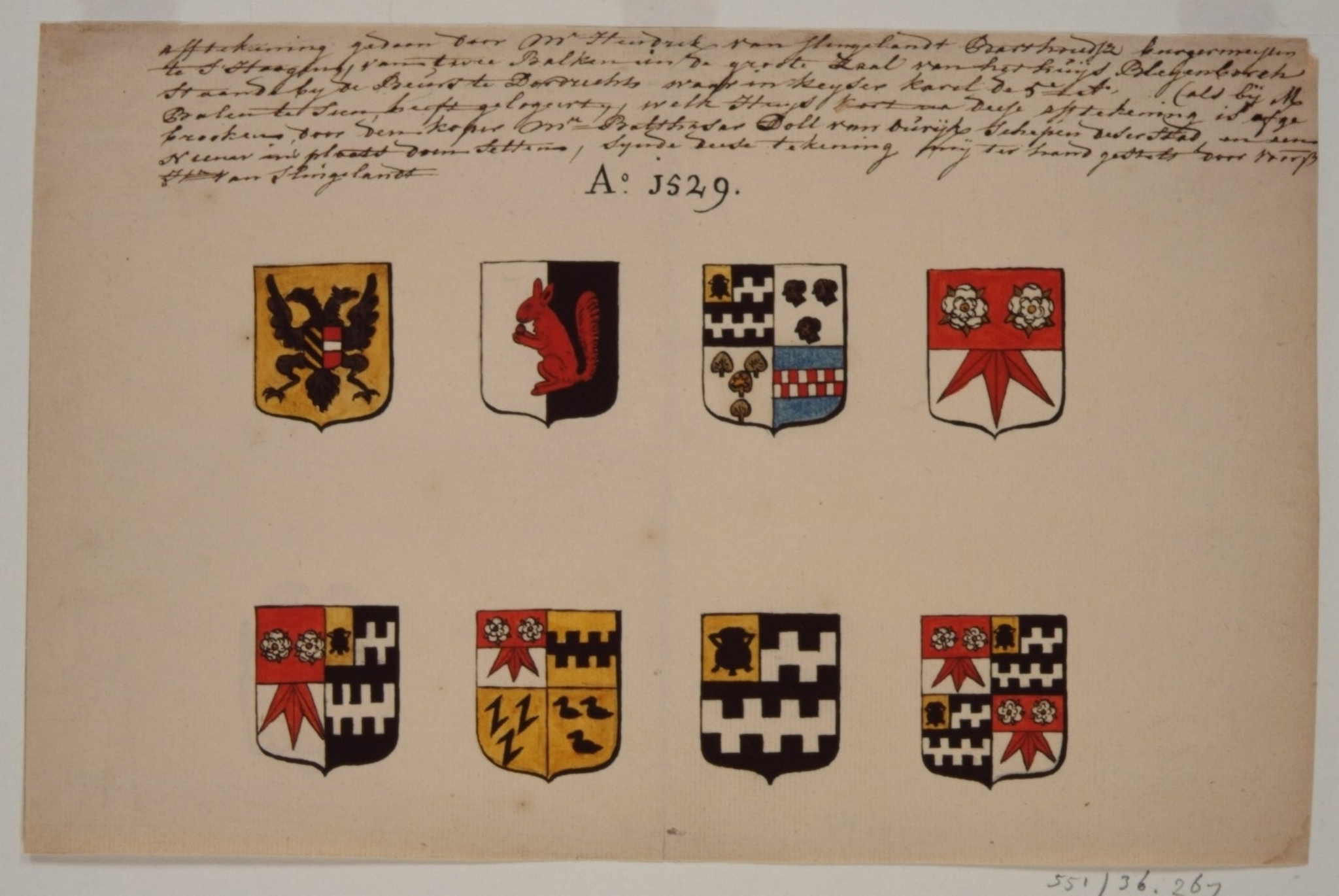 Wapens op balken in het huis Bleyenburg, anno 1529.