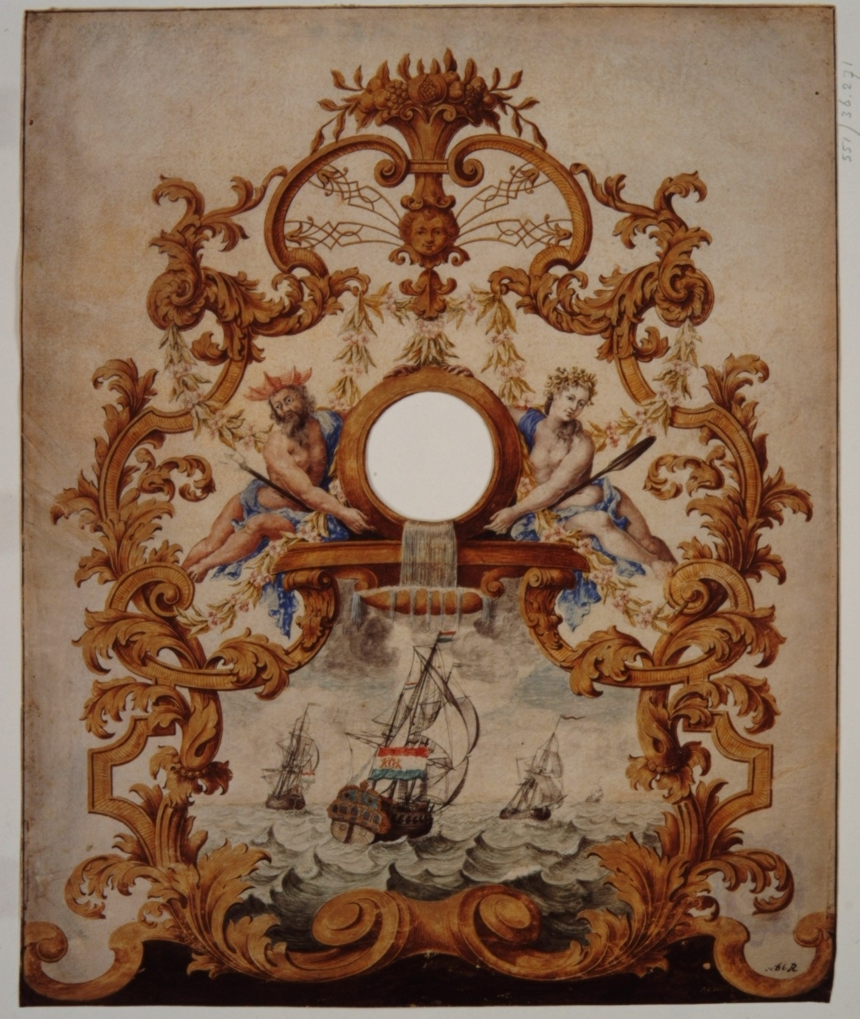 - Ontwerp voor een uurwerk, midden 18e eeuw. Een medaillon, waarvan het binnengedeelte is uitgesneden, om daarin een horloge of ander uurwerk te kunnen plaatsen, wordt vastgehouden door Neptunus en Amphitrite; uit de onderrand van het medaillon is stromend water getekend, dat in een schulpvormig bekken wordt opgevangen; lager een zeegezicht met vier schepen, waarvan dat op de voorgrond een Hollandse vlag met het Dordtse wapen voert. Alles omgeven door een randwerk in Lodewijk XV-stijl, dat aan het geheel de vorm geeft van een pendule.
