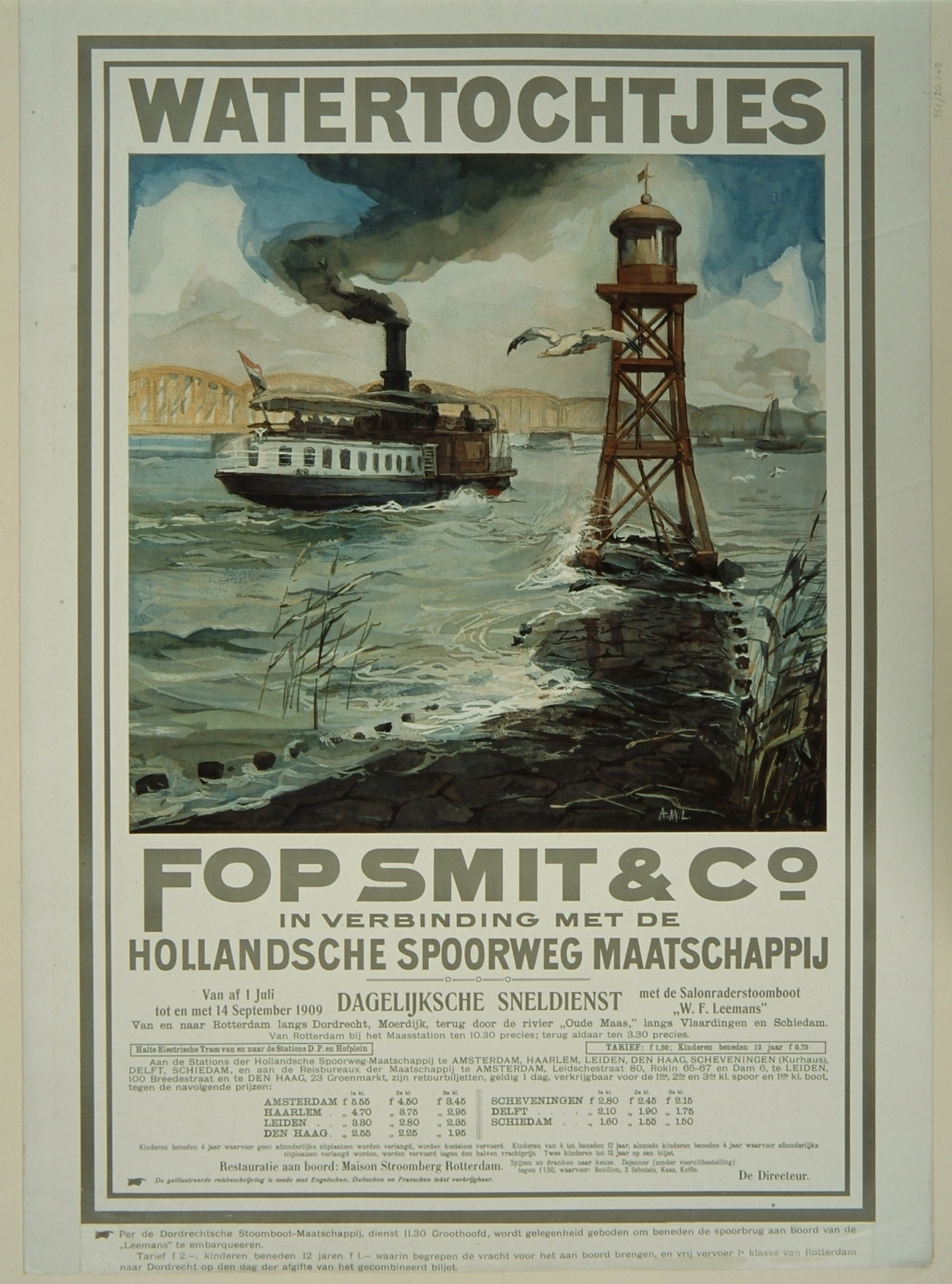 - Reclamebiljet voor de dagelijkse sneldienst tussen Rotterdam en Dordrecht van rederij Fop Smit & Co. in verbinding met de Hollandsche Spoorweg Maatschappij van 1 juli-14 september 1909 met de salonboot W.F. Leemans; met als afbeelding de W.F. Leemans de Dordtsche Kil uitstomende; links de spoorbrug over het Hollandsch Diep; rechts een lichtopstand.