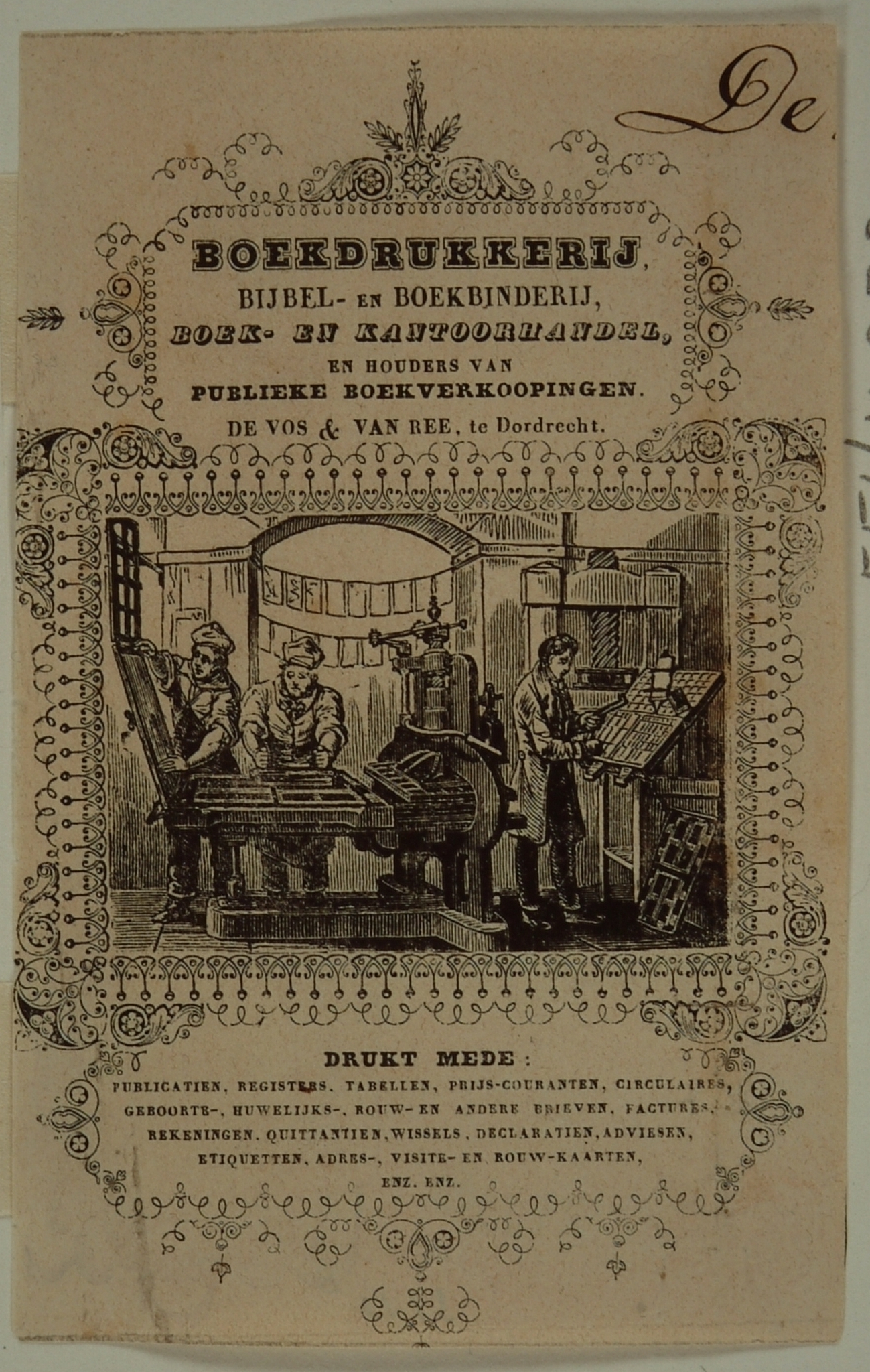 Reclamebiljet voor boekdrukker en -binder De Vos en Van Ree