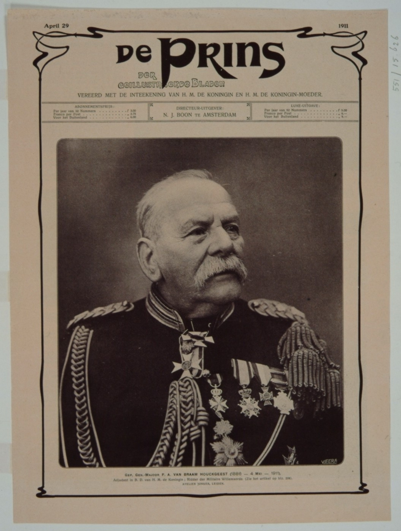 Naar foto van het atelier Jonker, Leiden; uit: De Prins van 29 april 1911; afmetingen: Hg. 23, br. 20 c. Nota Bene: Betreft Floris Adriaan van Braam Houckgeest, geboren te Amsterdam 1837, overleden 4 mei 1911; 2e luitenant der mariniers in 1857; kolonel-commandant van het corps in 1881, gepensioneerd met de rang van Generaal-Majoor in 1892; adjudant van H. M. de Koningin; Militie-Commissaris te Dordrecht 1893-1903 en voorzitter van het bestuur van de tentoonstelling der vereniging Voor Vak en Kunst in 1897.