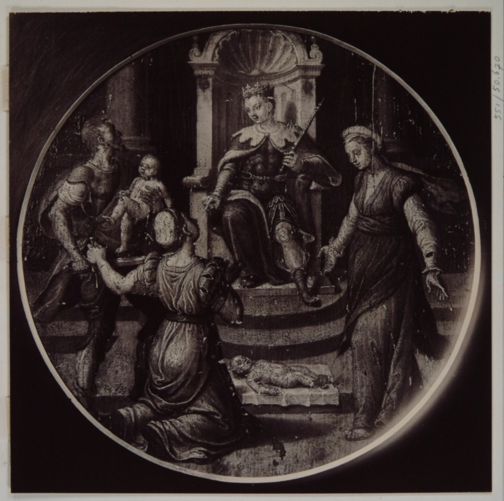 Jan van Drenckwaert Boudewijnszn., geb. Dordrecht 1543 en overl. Brussel 1606; Schout van Dordrecht, voorgesteld als Salomo die zijn eerste recht spreekt. Ongetwijfeld is dit het portret, dat van de Schout vervaardigd werd door de, om het geloof vervolgde, schilder Jan Wouterszn. van Cuyck, tijdens zijn gevangenschap in de Gevangenpoort te Dordrecht in 1572