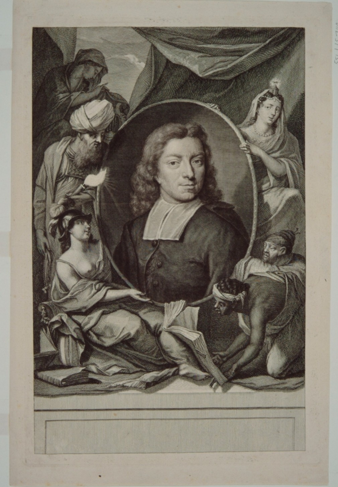 Borstbeeld van François Valentijn in ambtsgewaad op 38-jarige leeftijd, vastgehouden …