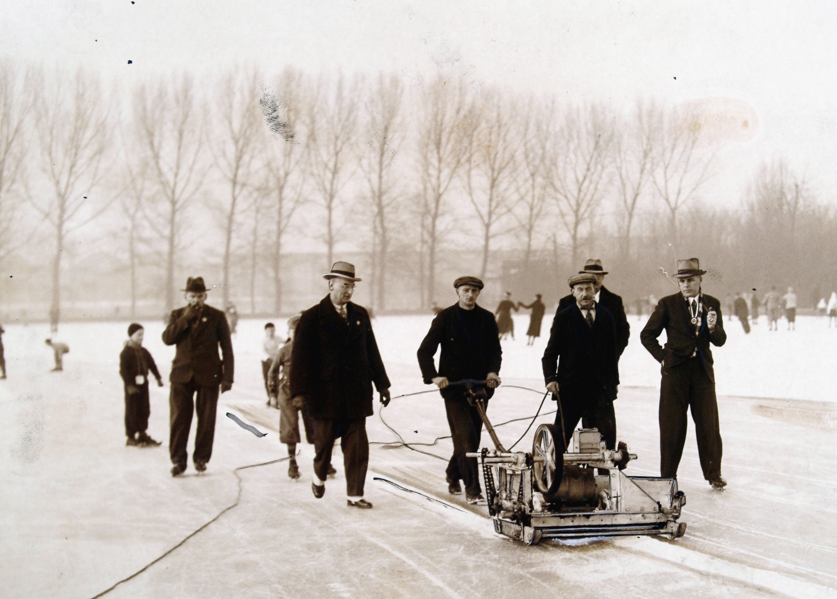 - De nieuwe ijsschaaf wordt uitgeprobeerd op de ijsbaan op de hoek Bankastraat/Oranjelaan. De 2e van links is dhr. Eras. Geheel rechts loopt dhr. P. Hoebee, uitvinder van deze ijsschaaf.