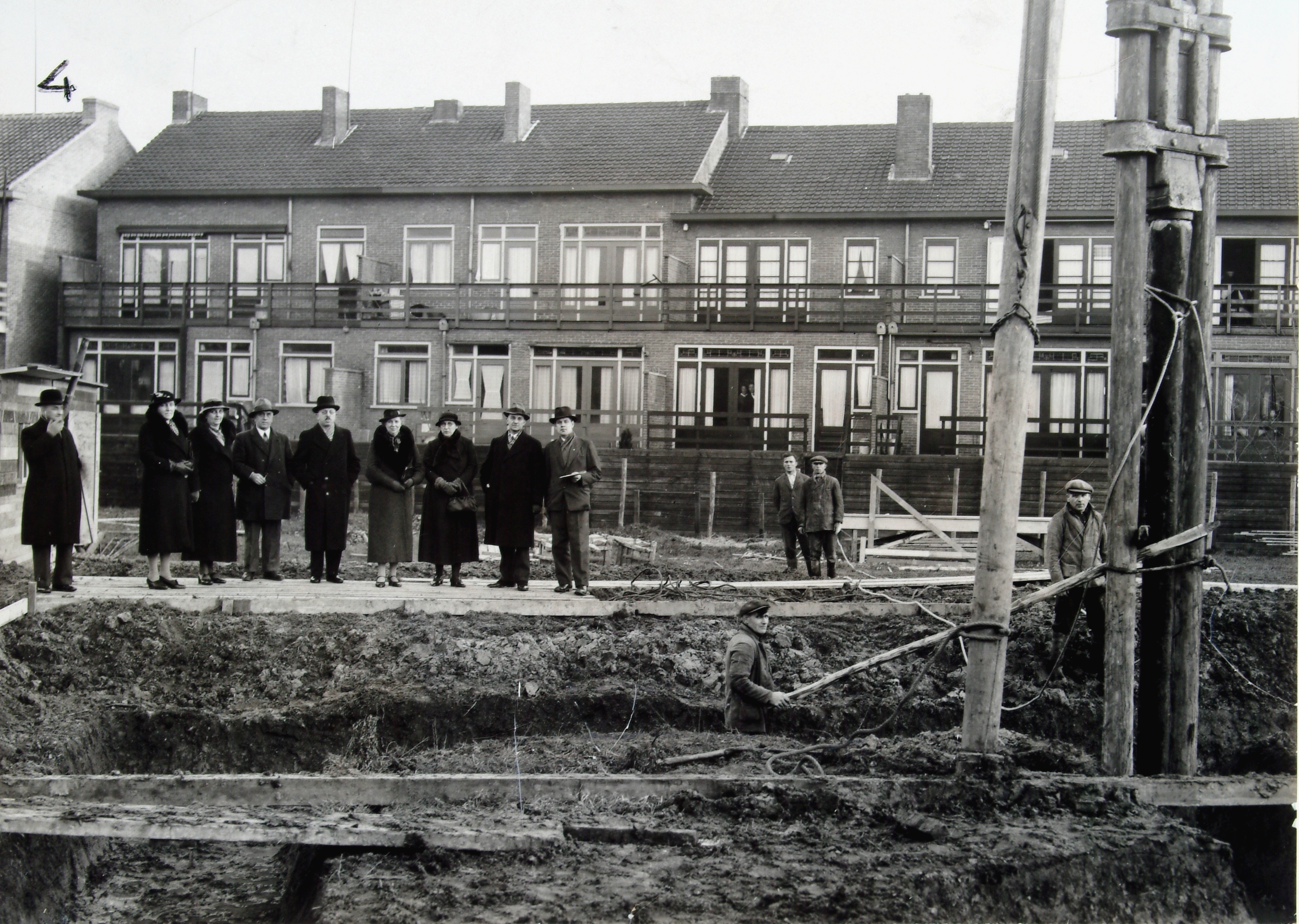 Het slaan van de eerste paal voor het doorgangshuis aan de Bankastraat