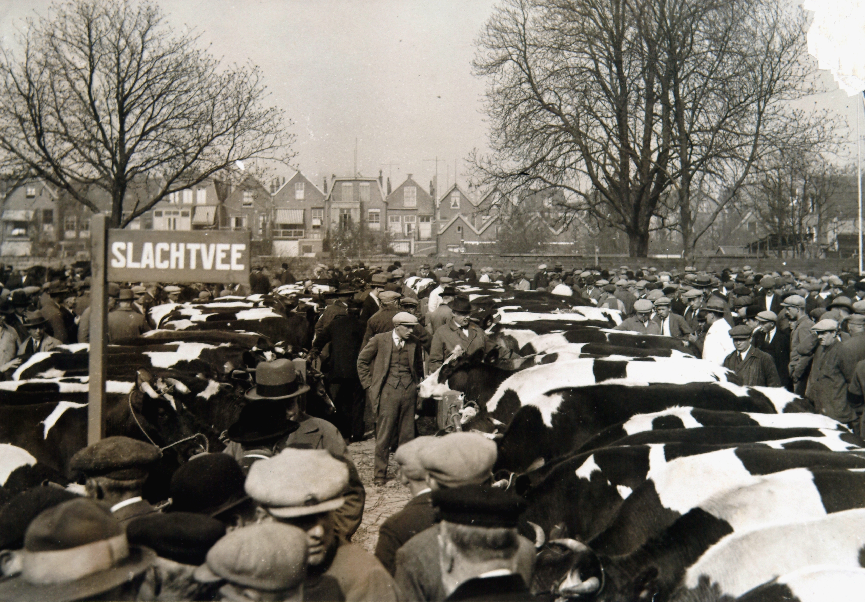 Veemarkt op de Veemarkt, gezien naar de achterkant van huizen op de Spuiweg.