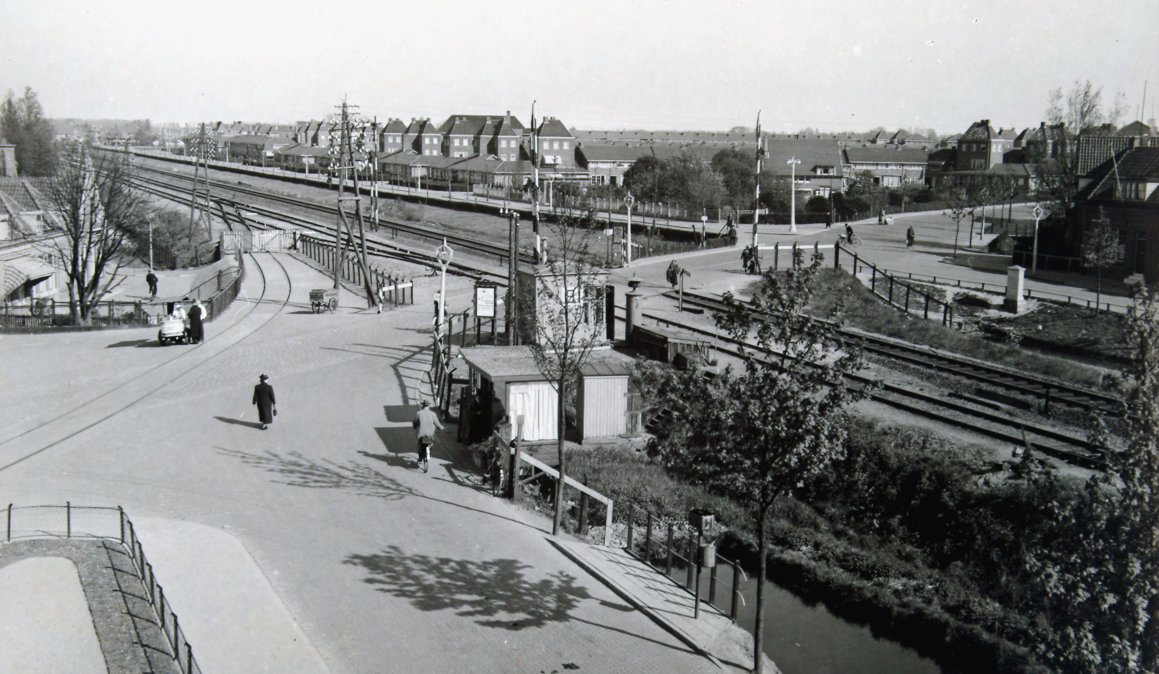 De overweg bij de Krommedijk en de Transvaalstraat (onder) naar het Land van Valk gezien. Rechts langs het spoor ligt de Crayensteynstraat, iets meer naar rechts de Dubbelmondestraat. De kiosk in het midden is een snackbar bij de nabijgelegen bushalte. De rails naar links zijn voor goederentreinen naar fabrieken op de Staart.