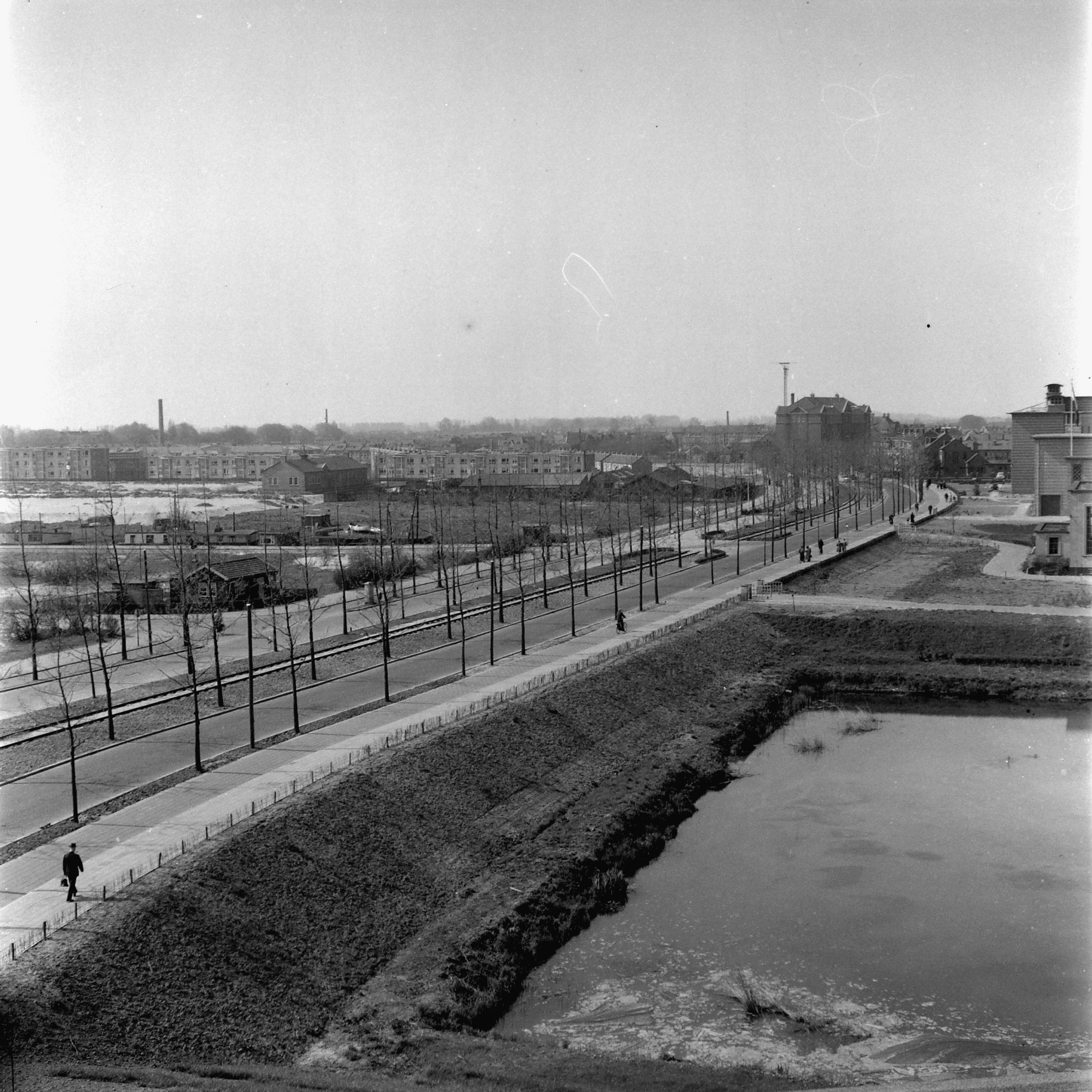In de middenberm het industriespoortje naar de Staart; de rails hier zijn in 1966 verwijderd. Rechts het 150 kV-transformatorstation van EZH aan de Oranjelaan/hoek Noordendijk. Vanuit dit station liepen 150 kV-kabels naar de Merwedehaven en naar de opstijgpunten van de lijnen naar Geertruidenberg en Rotterdam-Zuid. Het opstijgpunt van laatstgenoemde lijn lag in Zwijndrecht.
