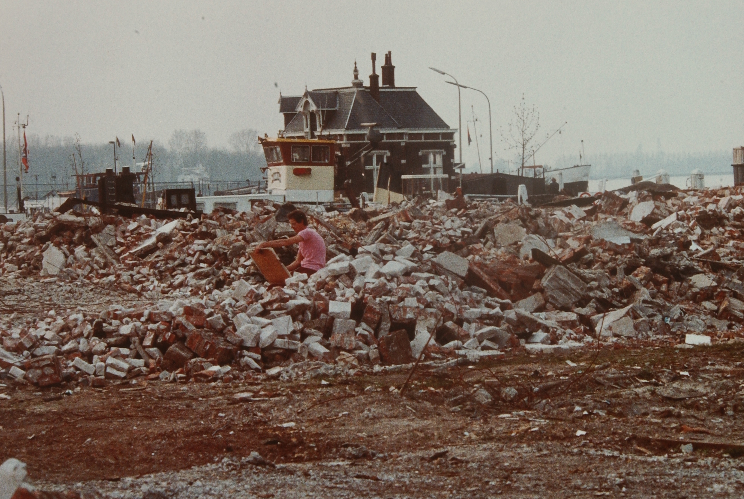 Tekenaar Led Brand schetsend op de puinhopen van afgebroken panden in de Noorderstraat. Het schip voor het veerhuis bij het Papendrechts veer ligt in de Riedijkshaven.