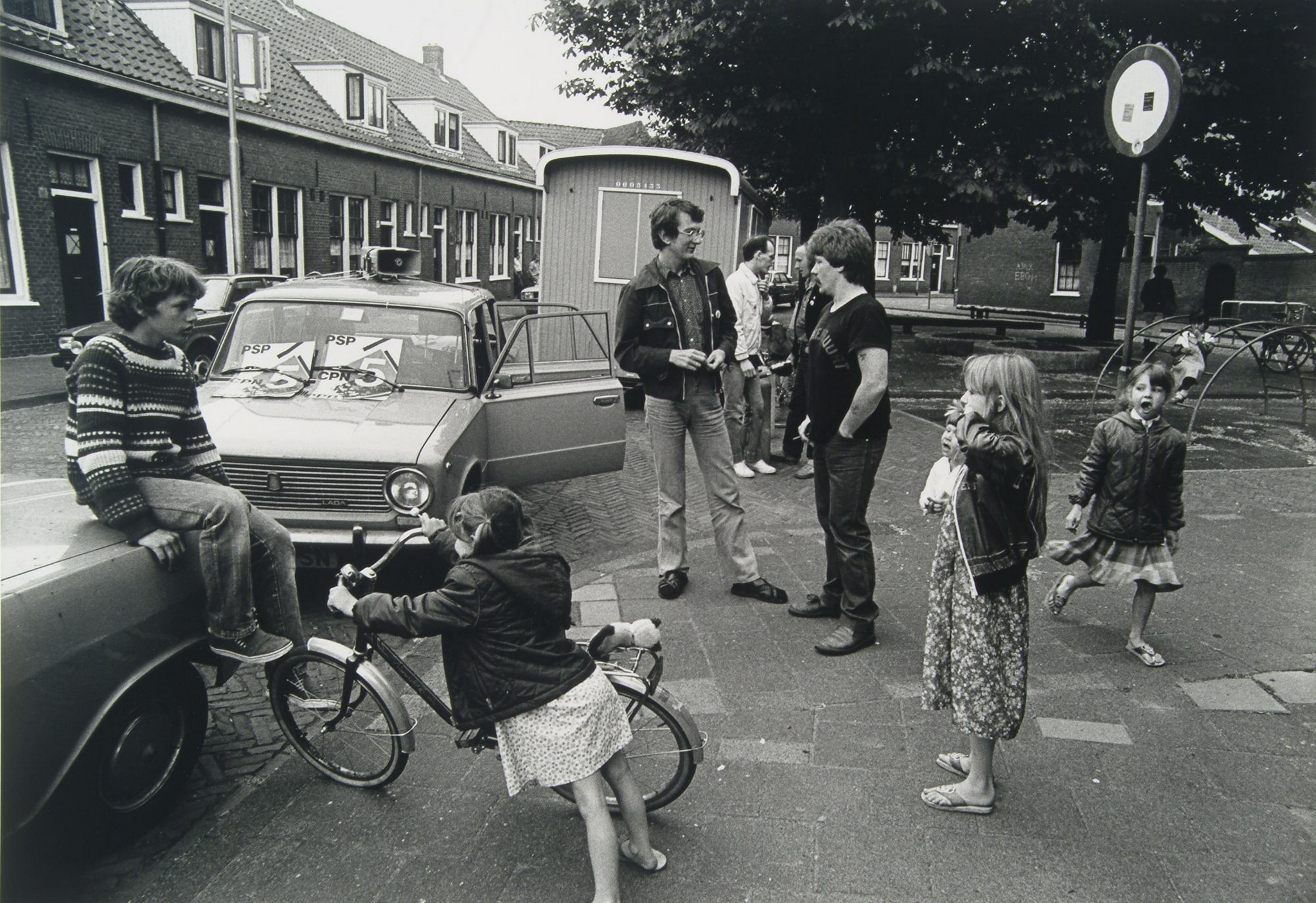 Gemeenteraadsverkiezingen mei 1982. Willy Verbakel (midden met bril) bij de geluidswagen in gesprek met bewoners van de Bloemenbuurt