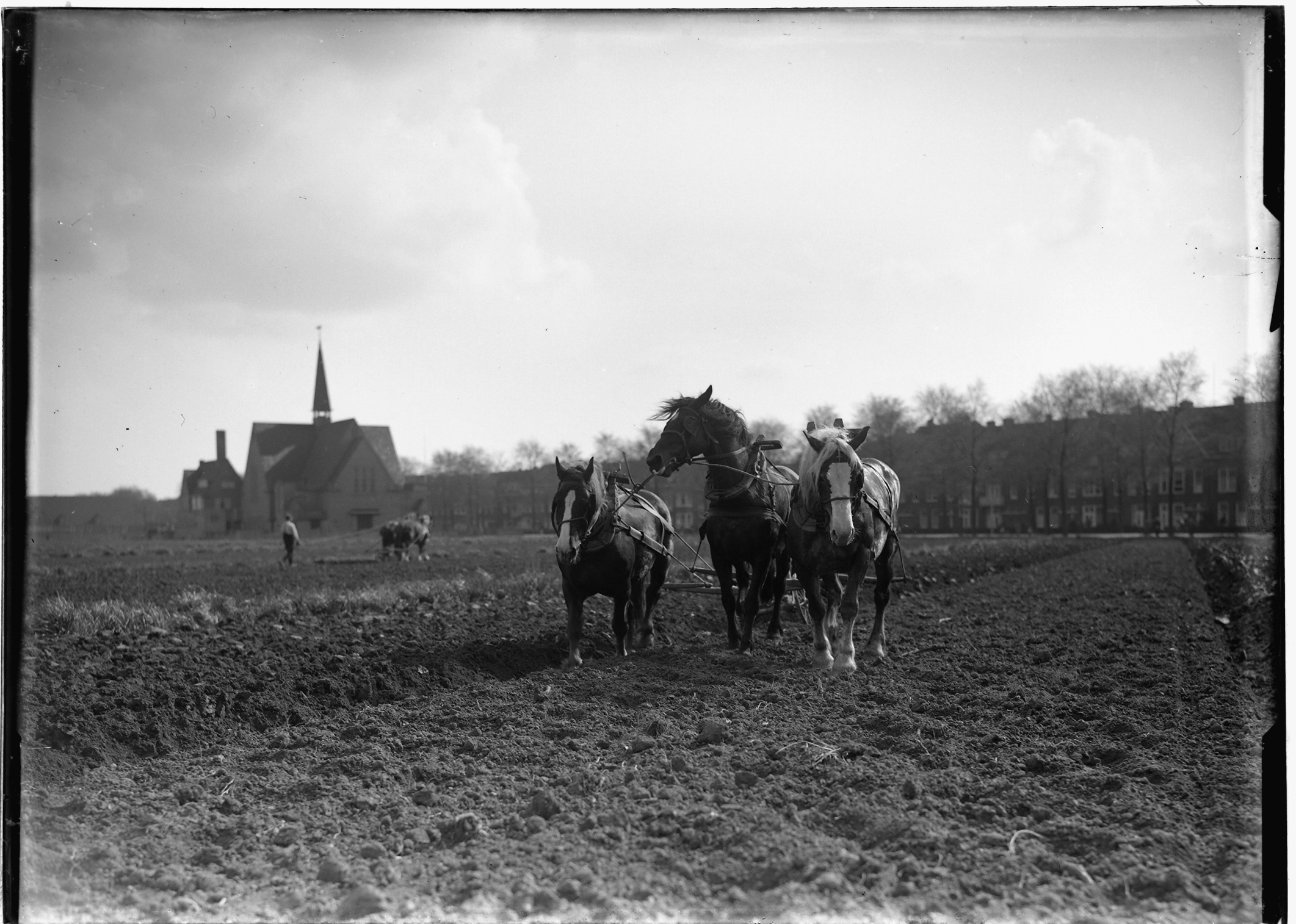 Ploegen van een akker langs de Krispijnseweg nabij de Julianakerk.
