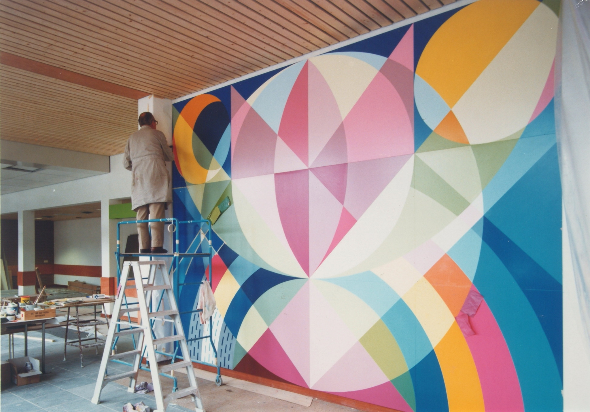Toon Winkel werkend aan een wandschildering in het gemeenteziekenhuis aan de Bankastraat