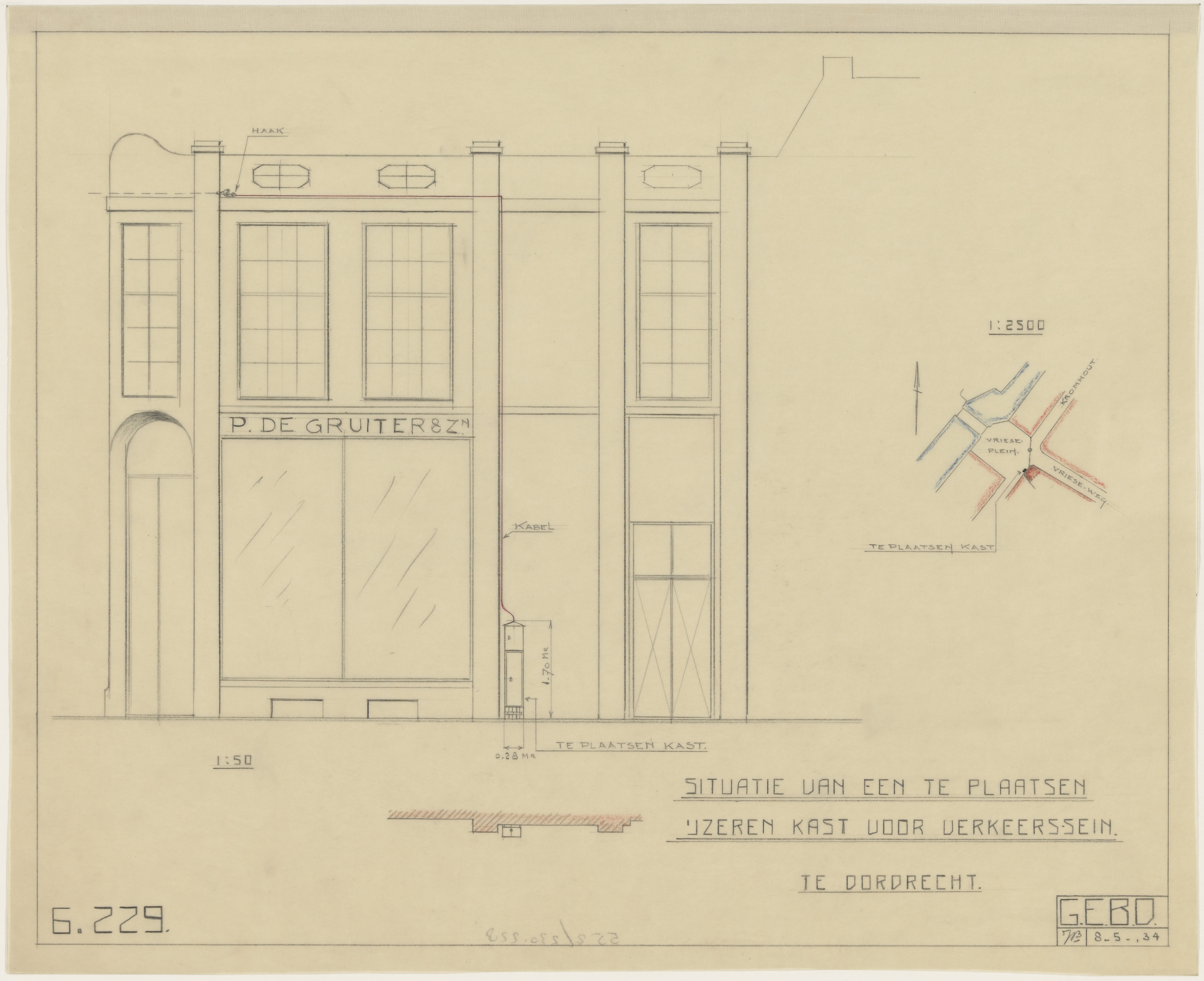 - Een situatietekening van een te plaatsen ijzeren kast voor een verkeerssein aan de gevel van de grutterswinkel van De Gruyter aan het Vrieseplein.