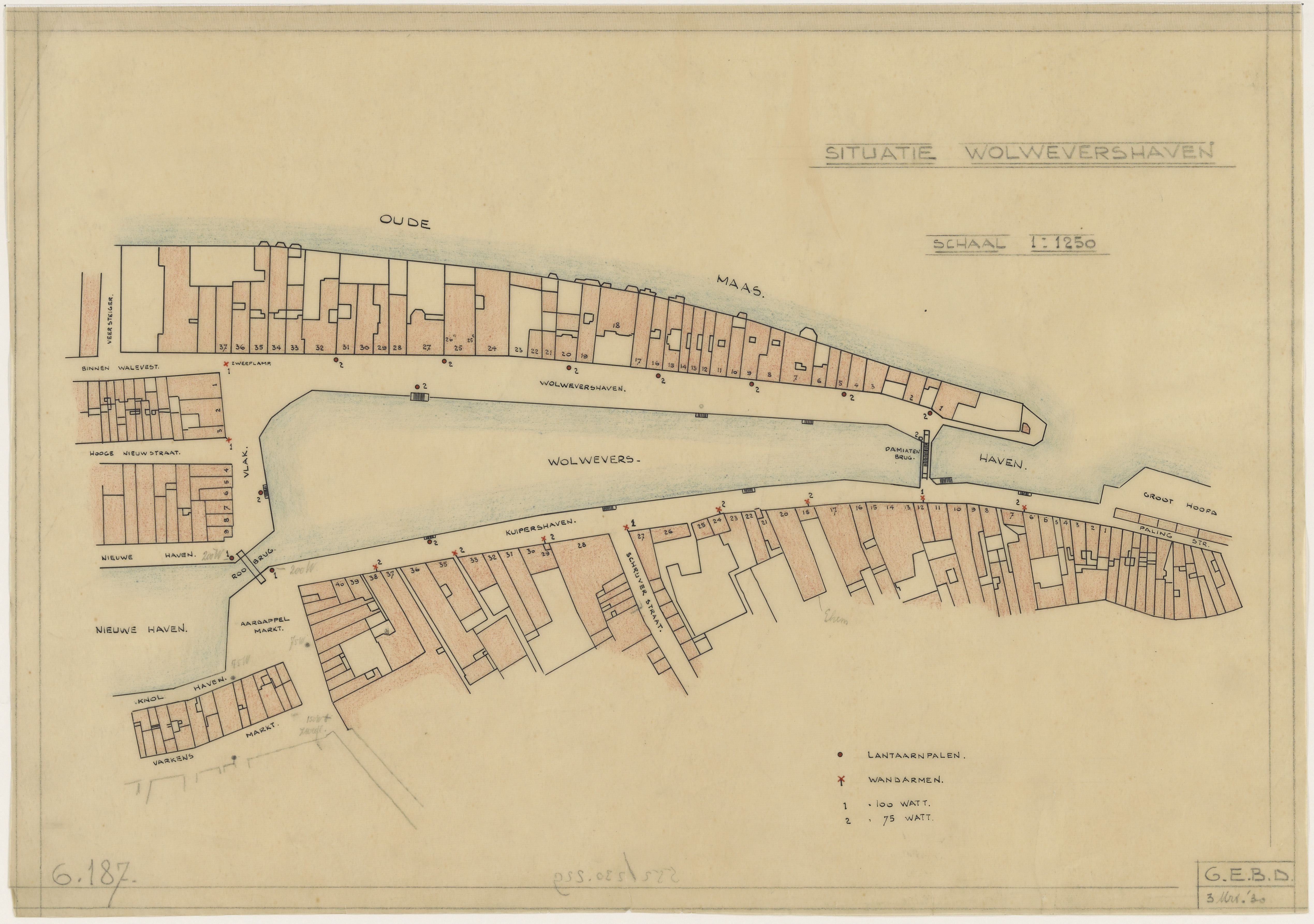 - Een plattegrond van het gebied rond de Wolwevershaven met aangegeven de lantaarnpalen en wandarmen.