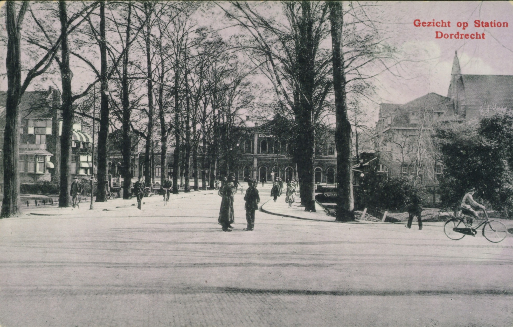 Gezicht op het Station. Links achter de bomen is Villa "Simpang" te zien en rechts Hotel Ponsen. De foto is genomen vanaf de hoek van de Singel.
