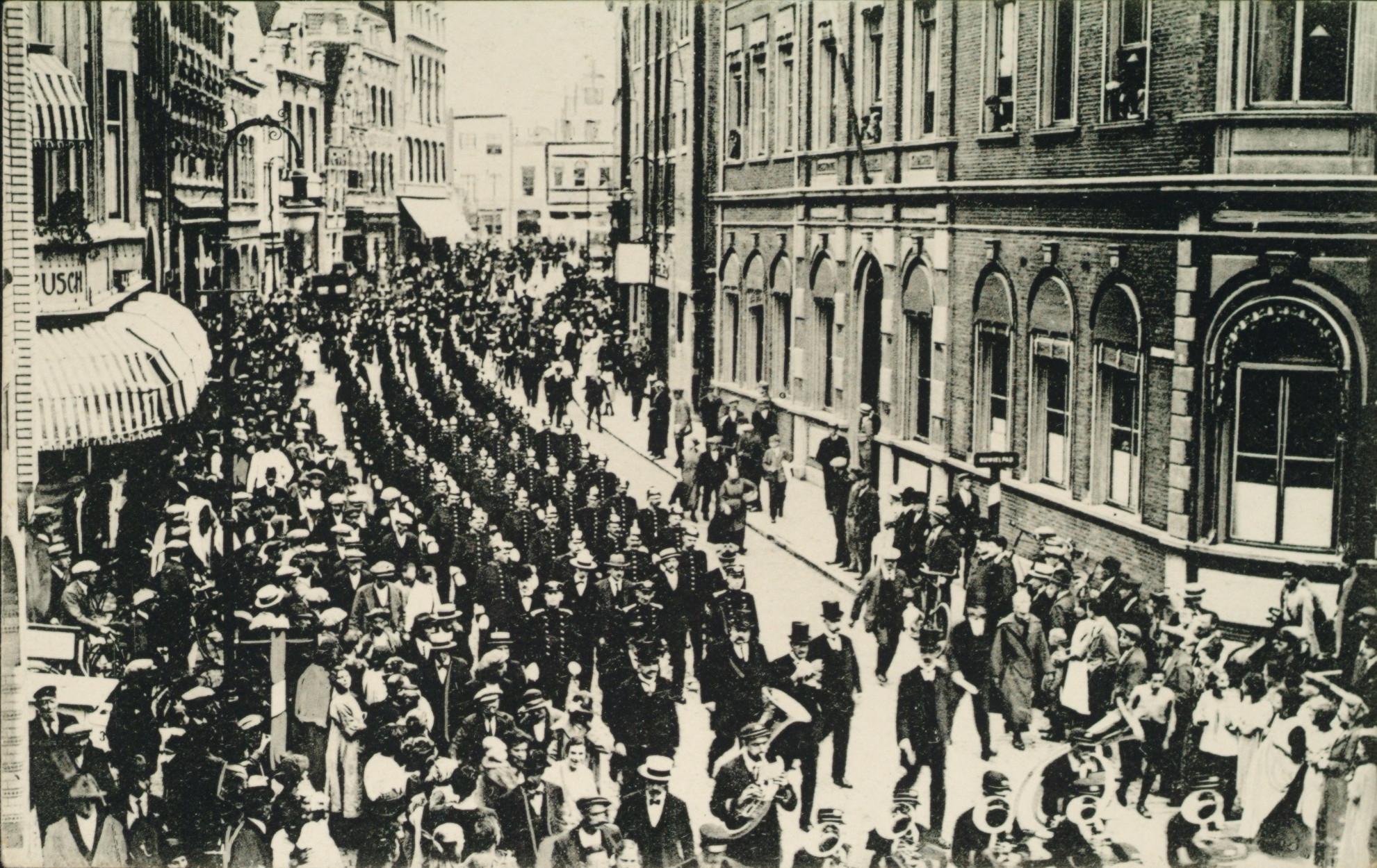 Op achterzijde is vermeld: "Het politiecorps op marsch om Burgem. Wijtema uitgeleide te doen"