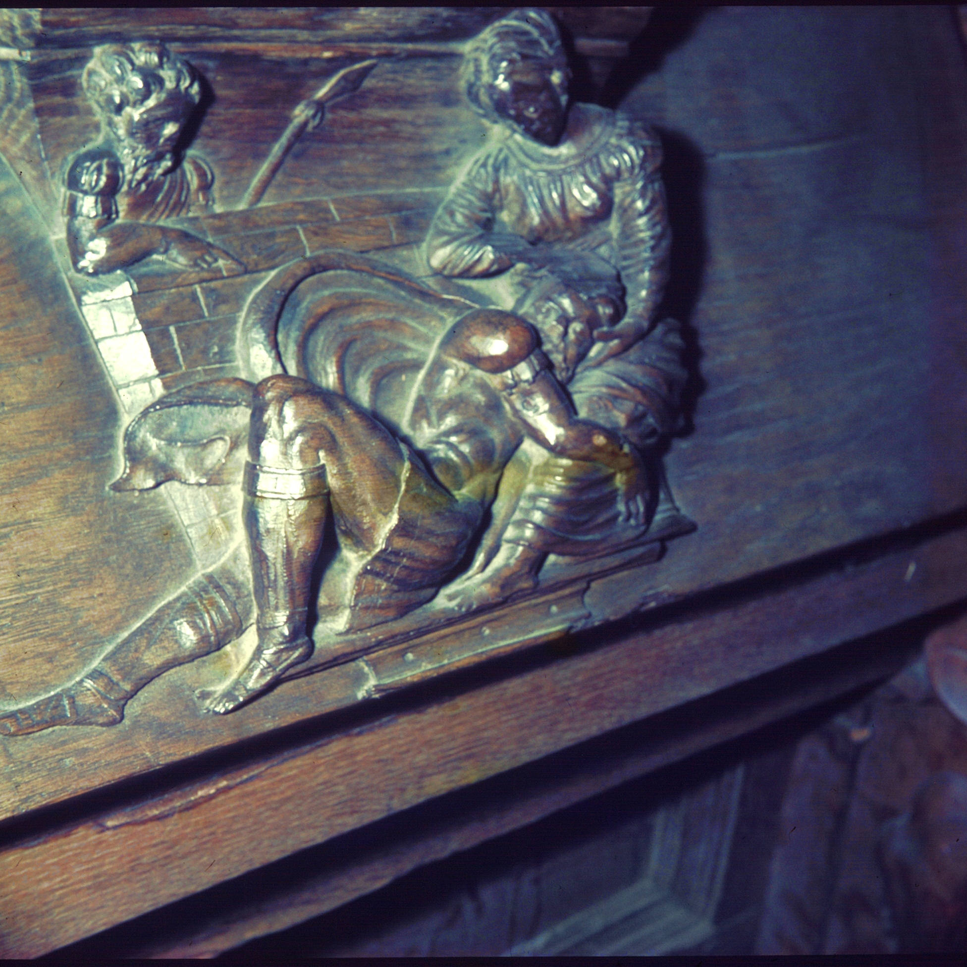 Detail van een bank in houtsnijwerk in de Grote Kerk te Dordrecht.
