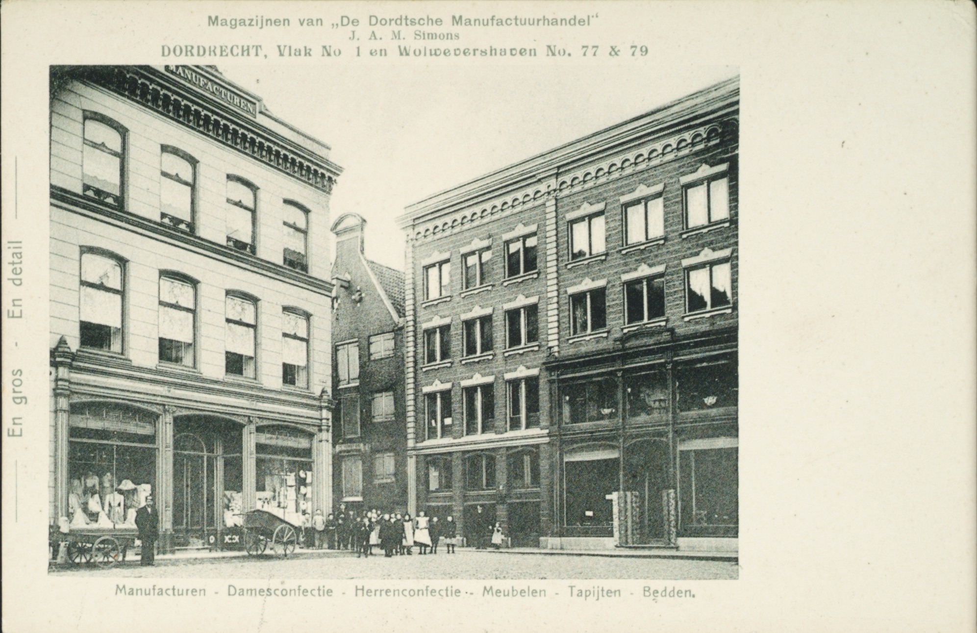 - Reclamefoto van De Dordtsche Manufactuurhandel van J.A.M. Simons op het Vlak nr. 1 en Wolwevershaven nr. 77 & 79. In het midden de hoek van de Binnen Walevest.