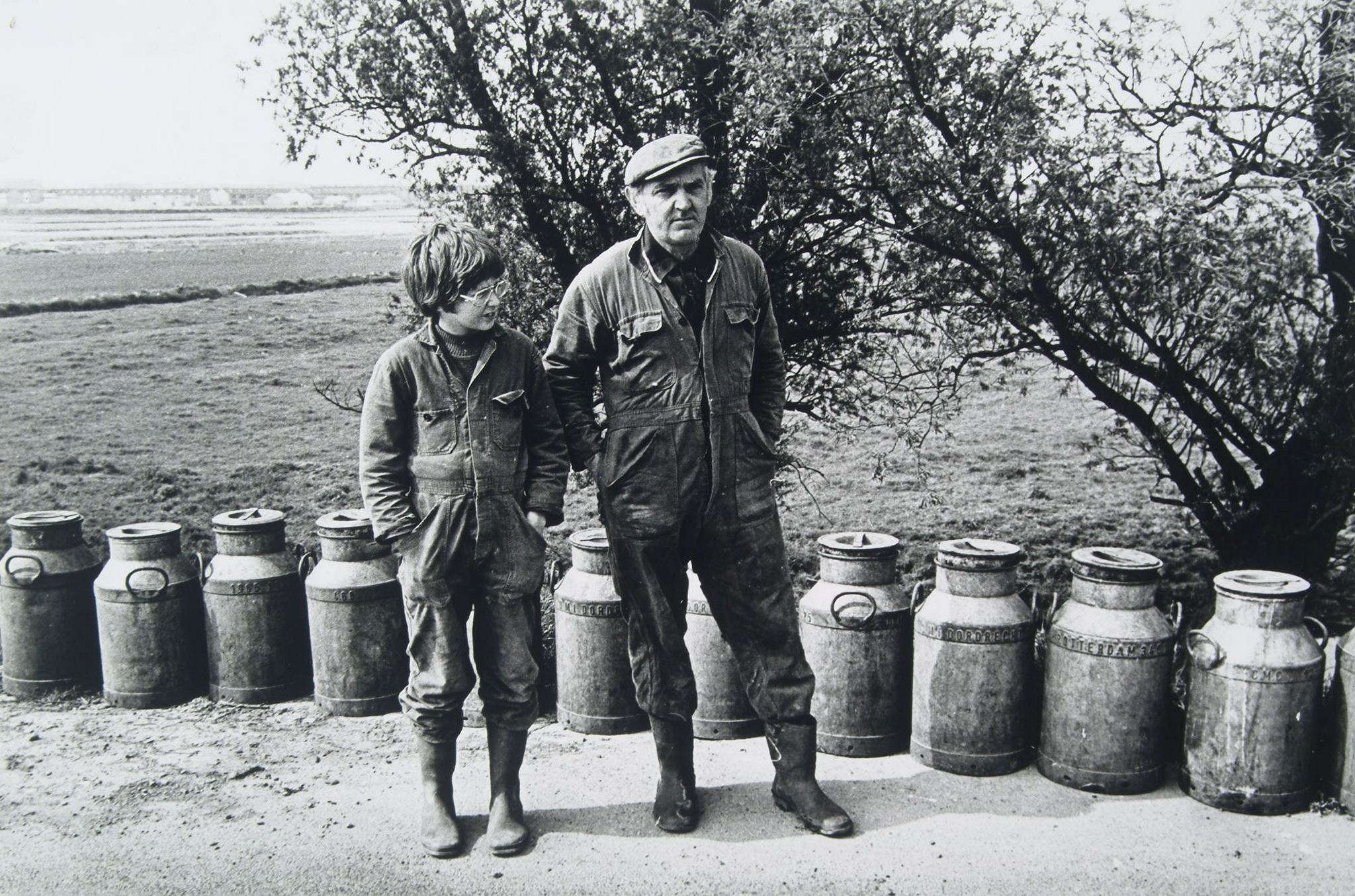 Melkboer en zoon en poserend naast een rij melkbussen. Op de achtergrond de bouw van …