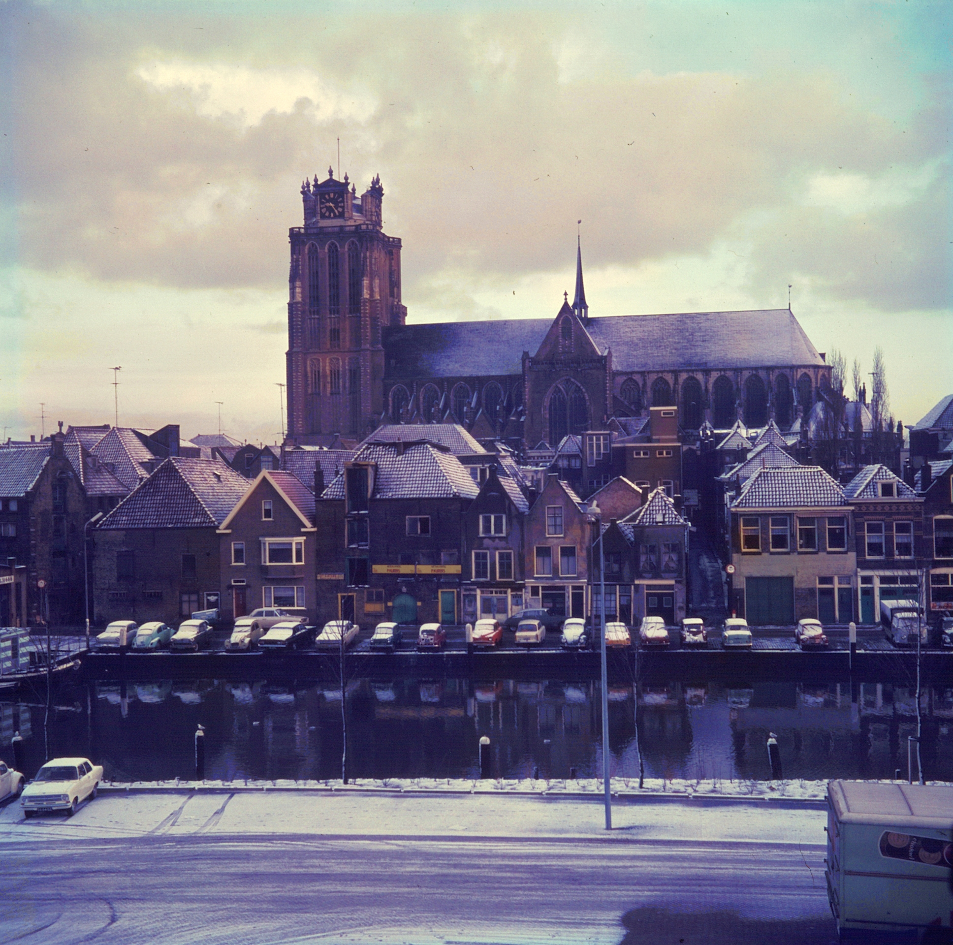 - Wintergezicht op de Spuiboulevard, achter het water ligt de Boogjes, op de achtergrond de Grote Kerk..