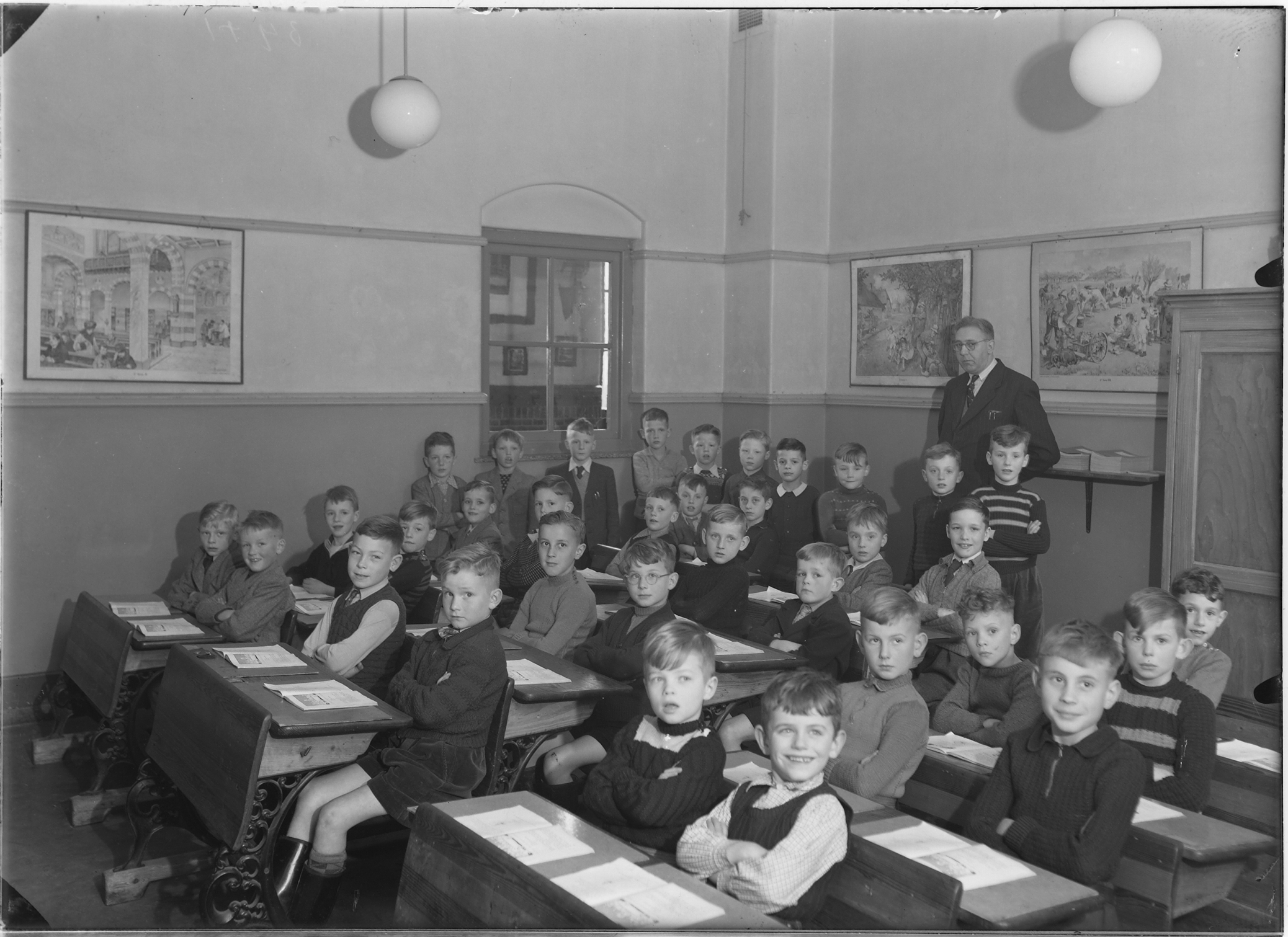 - klaslokalen leerlingen / scholieren onderwijzers scholen schoolbanken schoolplaten