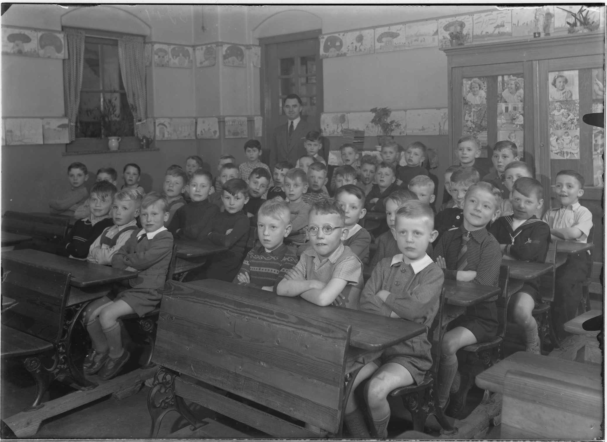 - klaslokalen leerlingen / scholieren onderwijzers scholen schoolbanken schoolplaten