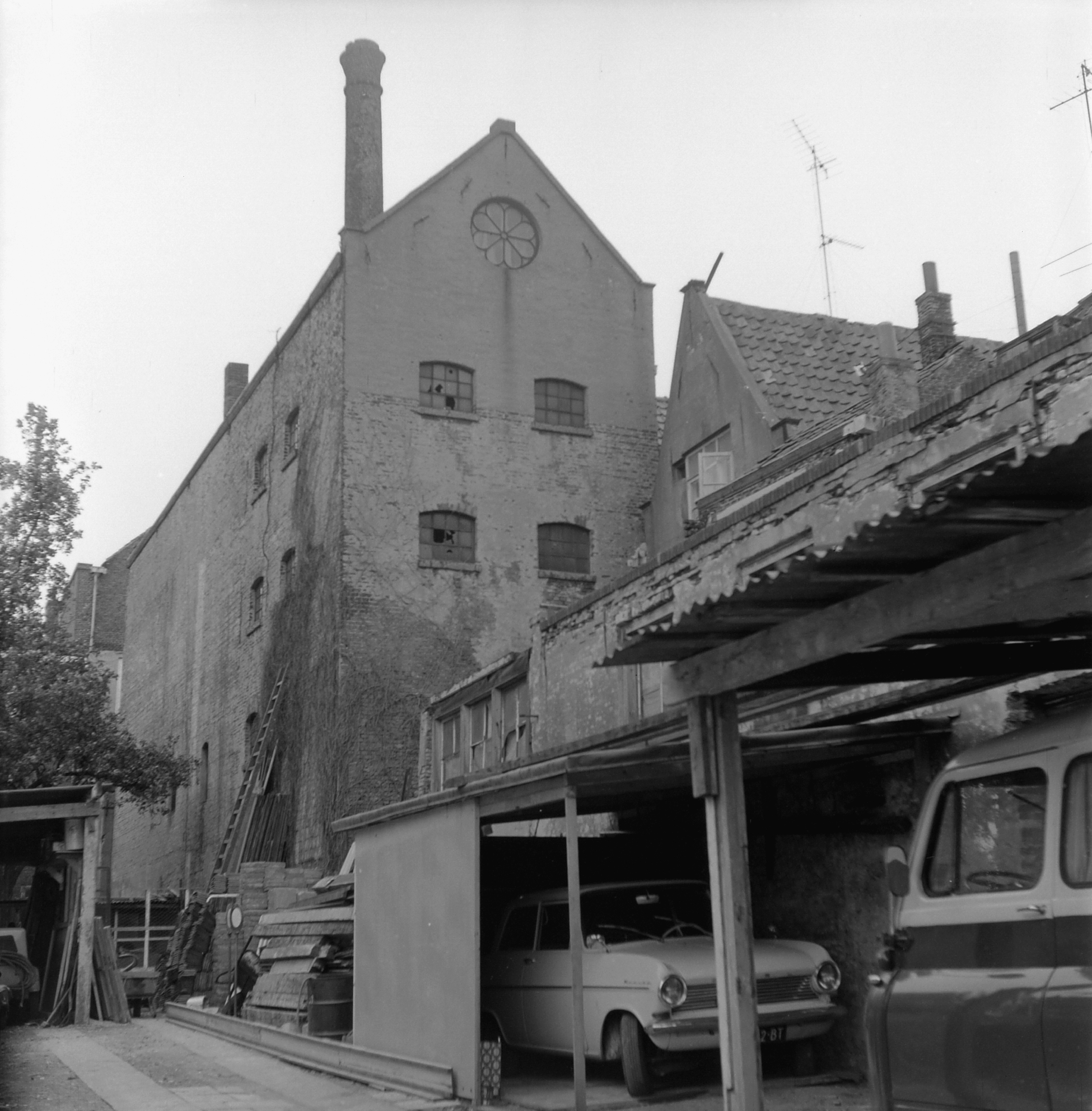 De achterkant van bebouwing aan de Nieuwstraat gezien vanaf het binnenterrein tussen de …