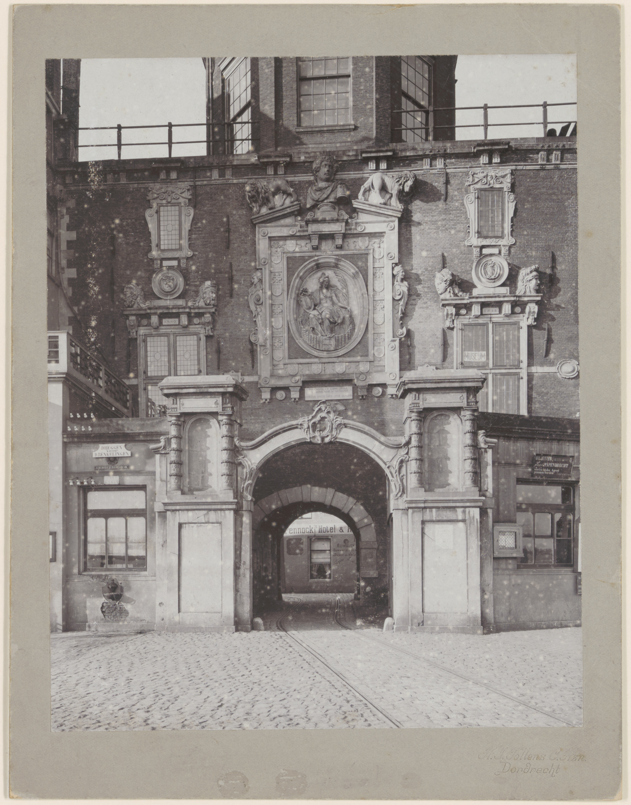 - Onderstuk van de Groothoofdspoort. Door de poort lopen de rails van de paardentram. Op de achtergrond hotel Pennock in de Palingstraat.