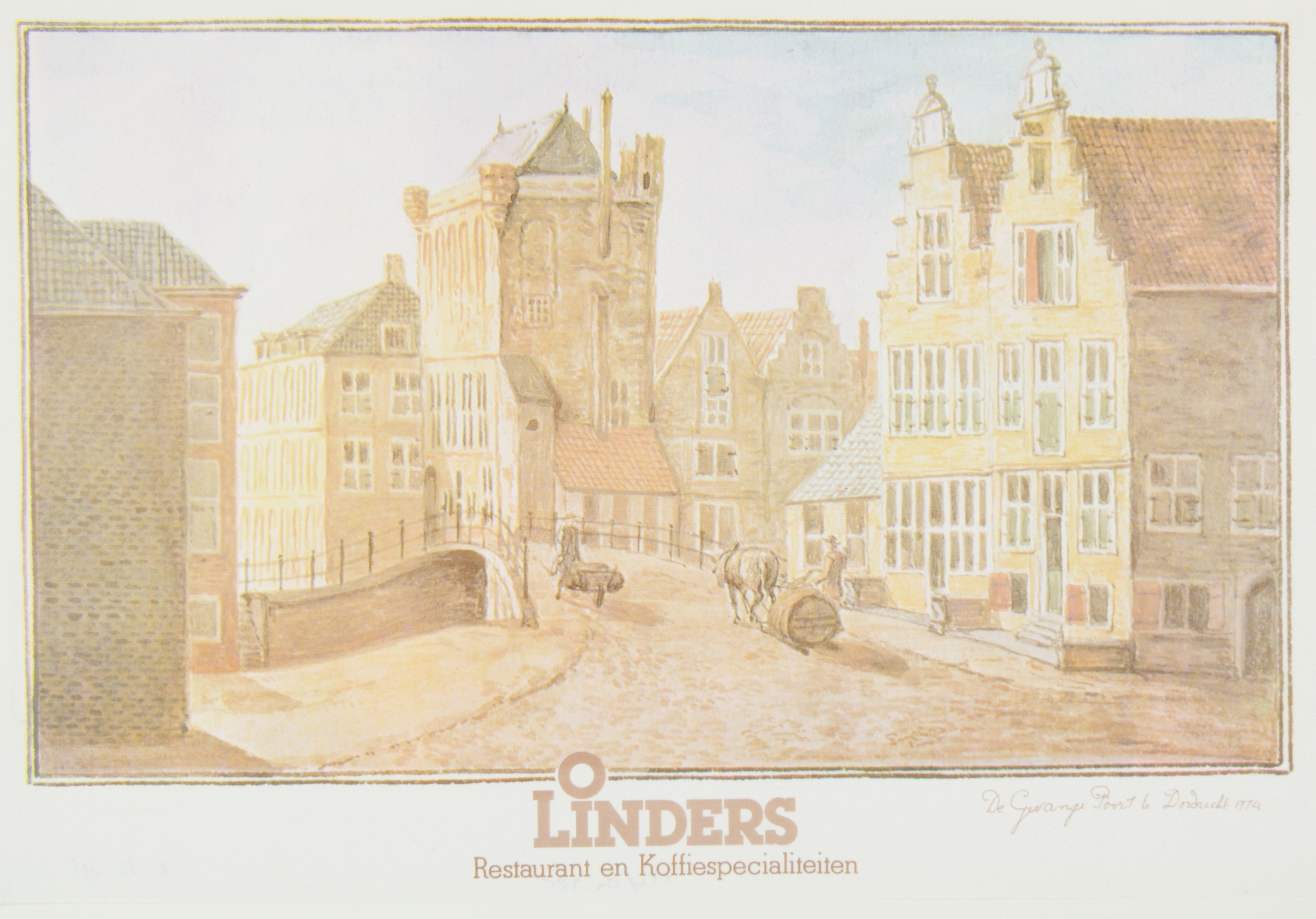 - Stadsgezicht naar oude tekening afgedrukt op placemats van warenhuis Linders: Gevangenpoort.