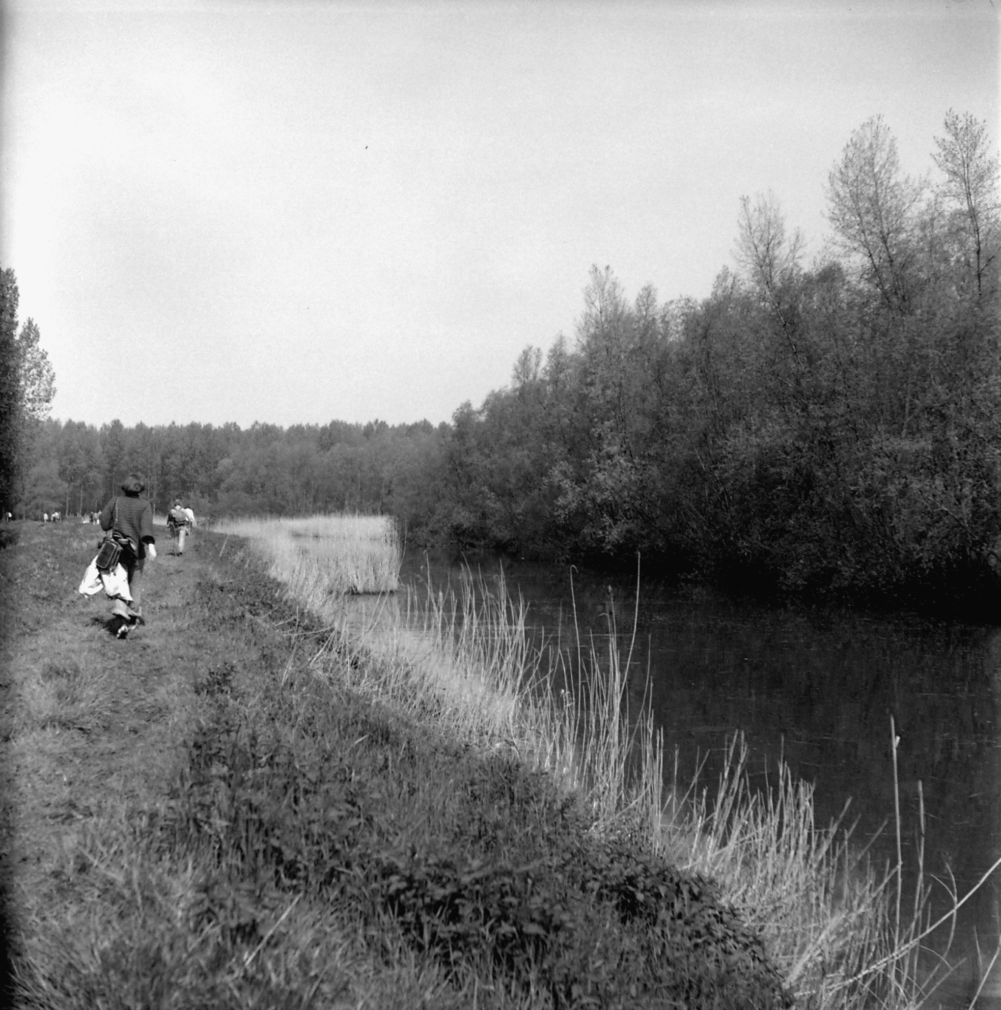 wandelaars lopen langs het Katse Gat, links bevindt zich (niet zichtbaar) het productiebos van de Oude Kat, voor hen dat in de Huiswaard.