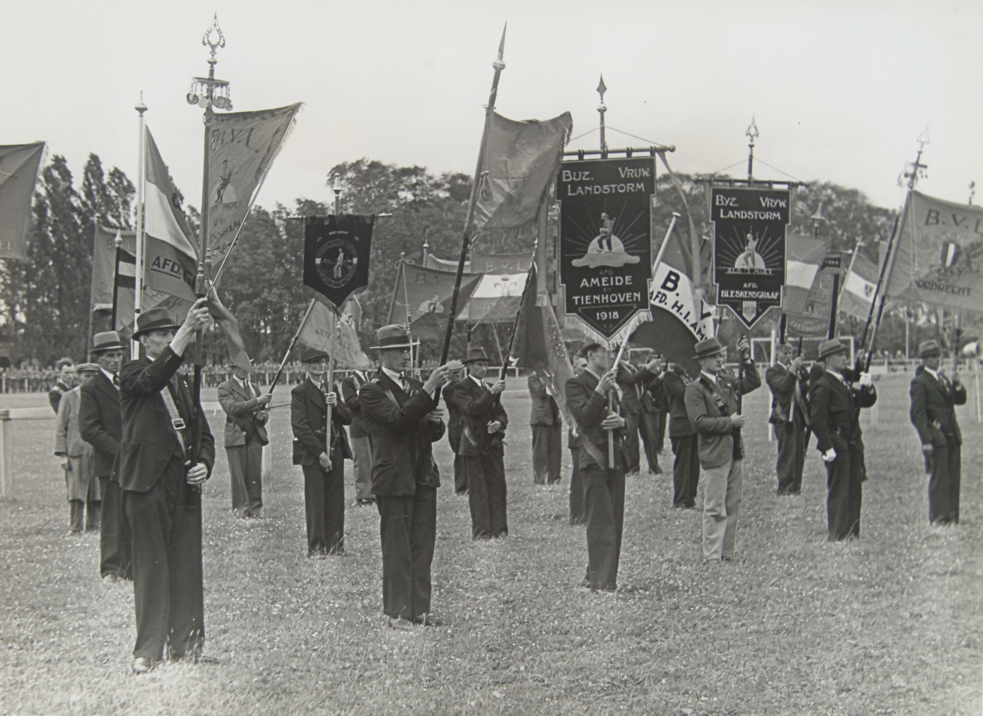 - Opstelling vaandels tijdens de landdag van de Bijzondere Vrijwillige Landstorm gehouden op 8 juli 1938 in het sportpark Reeweg