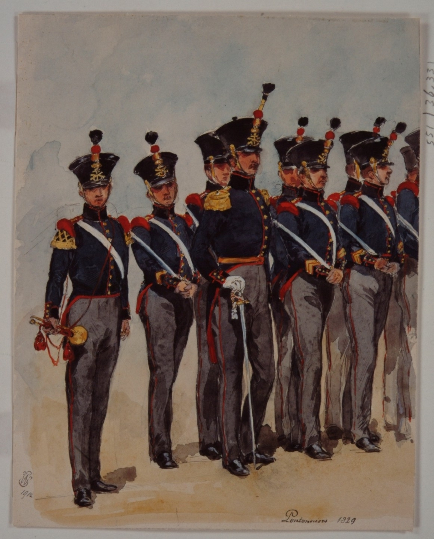 - Uniformen der Pontonniers van 1814-1829. Pontonniers in 1829. Officier en hoornblazer in groot tenue; soldaat in kapotjas.