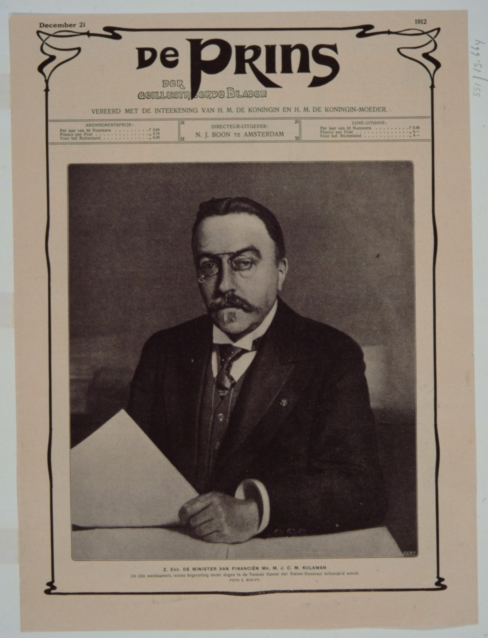 - Uit: De Prins, 21 december 1912; afmetingen:Hg. 23, br. 20 c. Notra Bene: Betreft mr. Maximilien Joseph Caspar Marie Kolkman, geboren te Dordrecht op 9 maart 1853; gedurende het ministerie Heemskerk minister van finaciën
