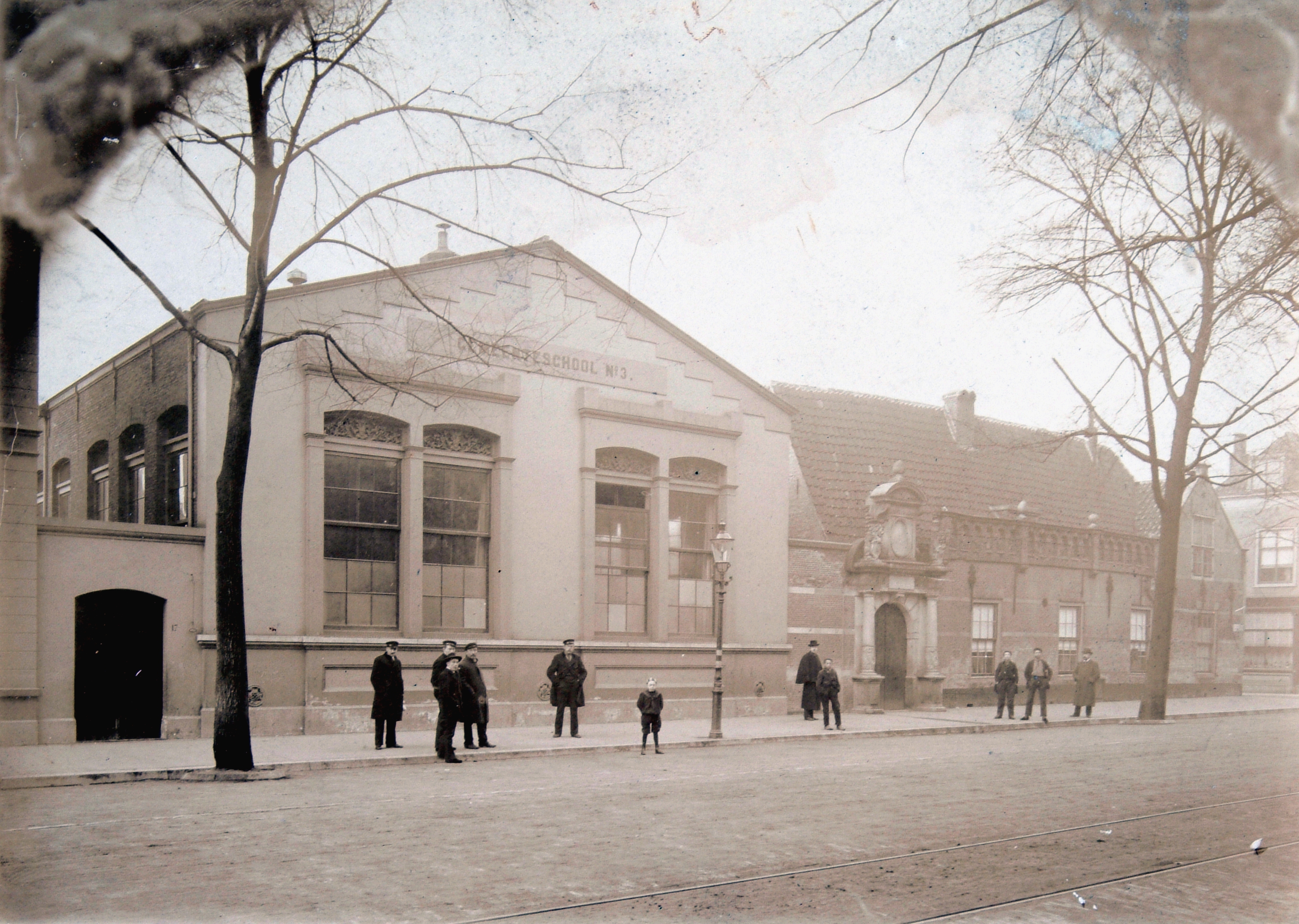 De gemeenteschool nr. 3 aan het Bagijnhof, rechts ervan het Oude Vrouwenhuis met de …