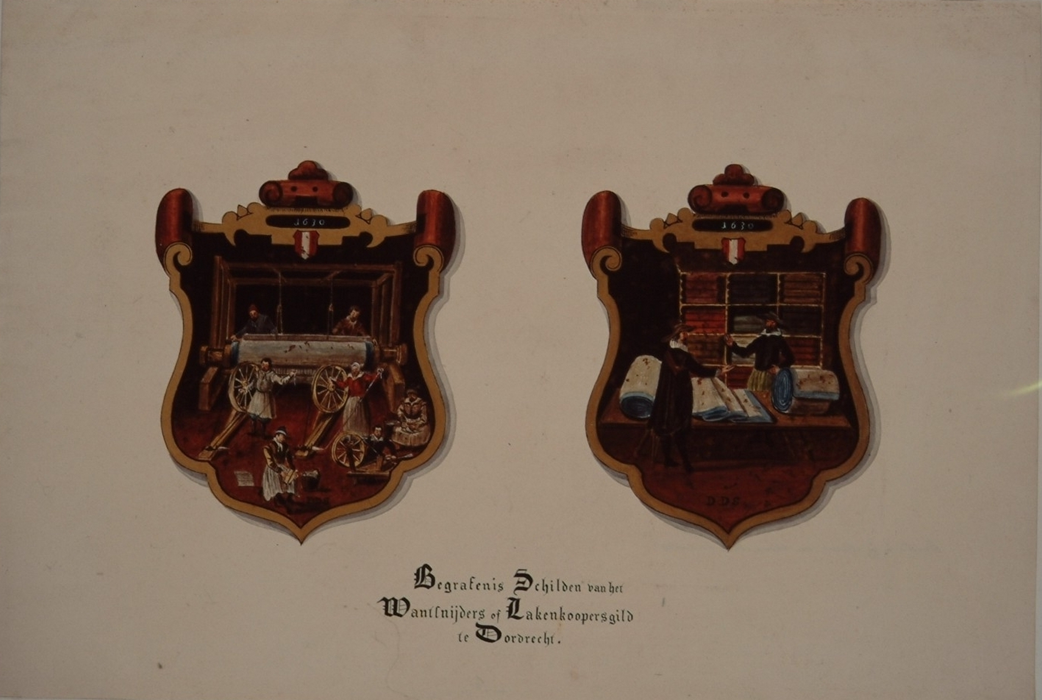 - Begrafenisschilden van het Wantsnijders- of Lakenkopersgilde; beschilderd met voorstellingen aan het bedrijf van het gilde ontleend en met jaartal 1630