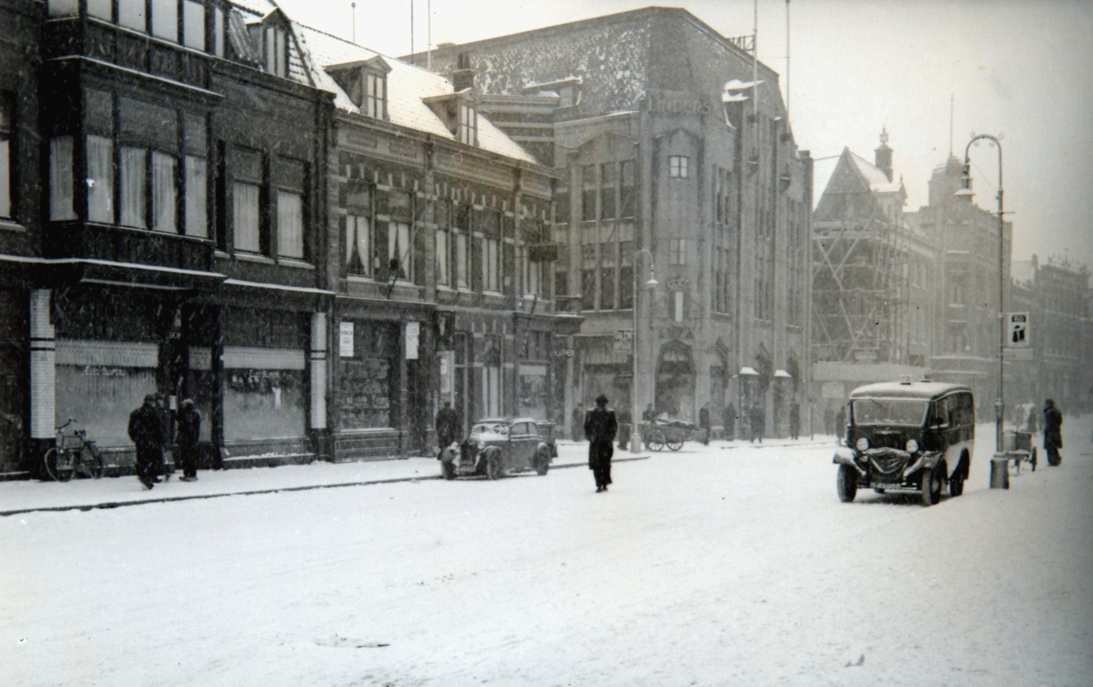 - Gezicht op de zuidelijke bebouwing van het Bagijnhof, het grote pand in het midden is de winkel "Linders", op de hoek van de voormalige Raamstraat