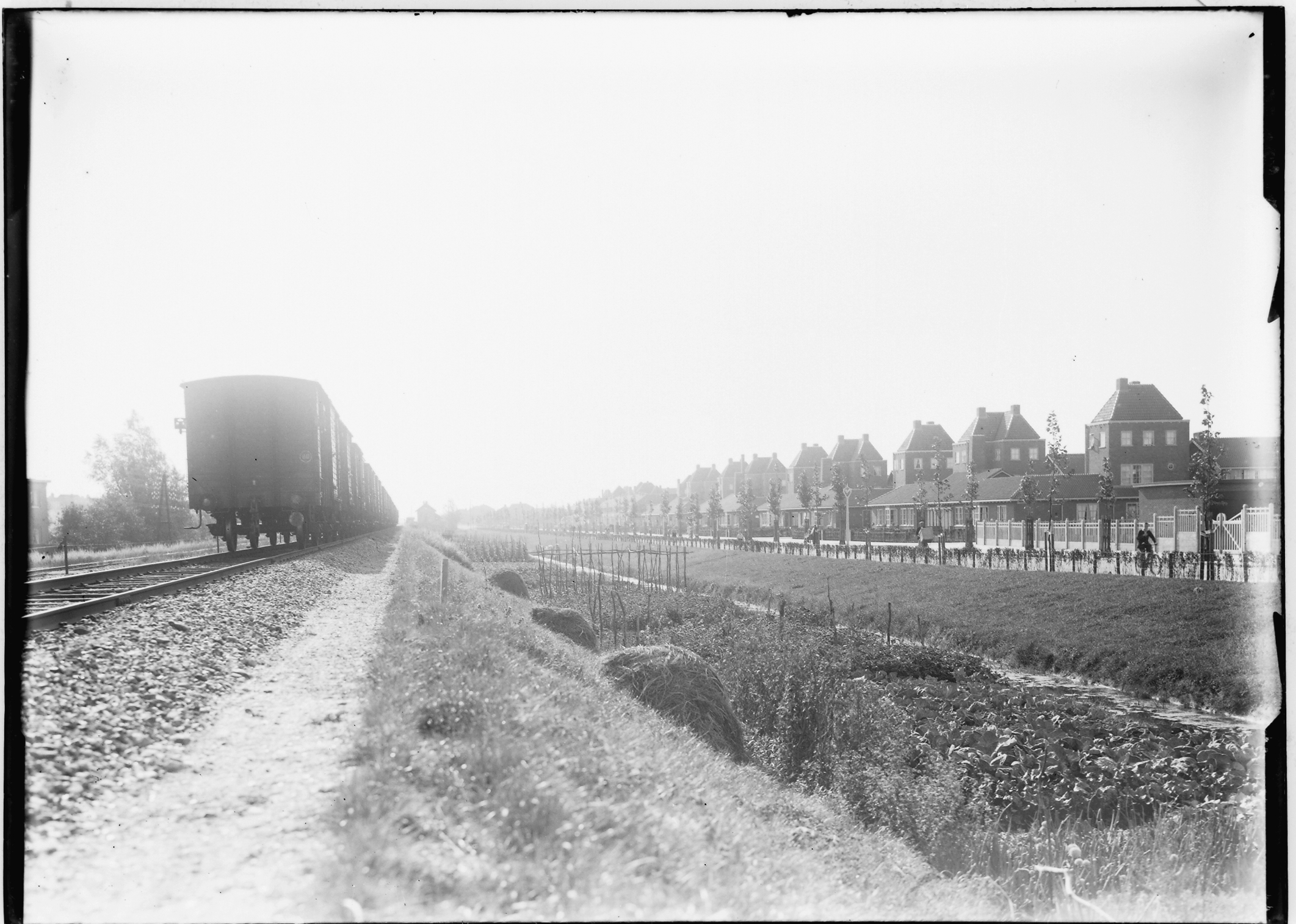 - Spoorbaan langs de Crayensteynstraat, gezien naar het oosten. Langs de spoordijk liggen tuintjes waar meestal groenten werden gekweekt.