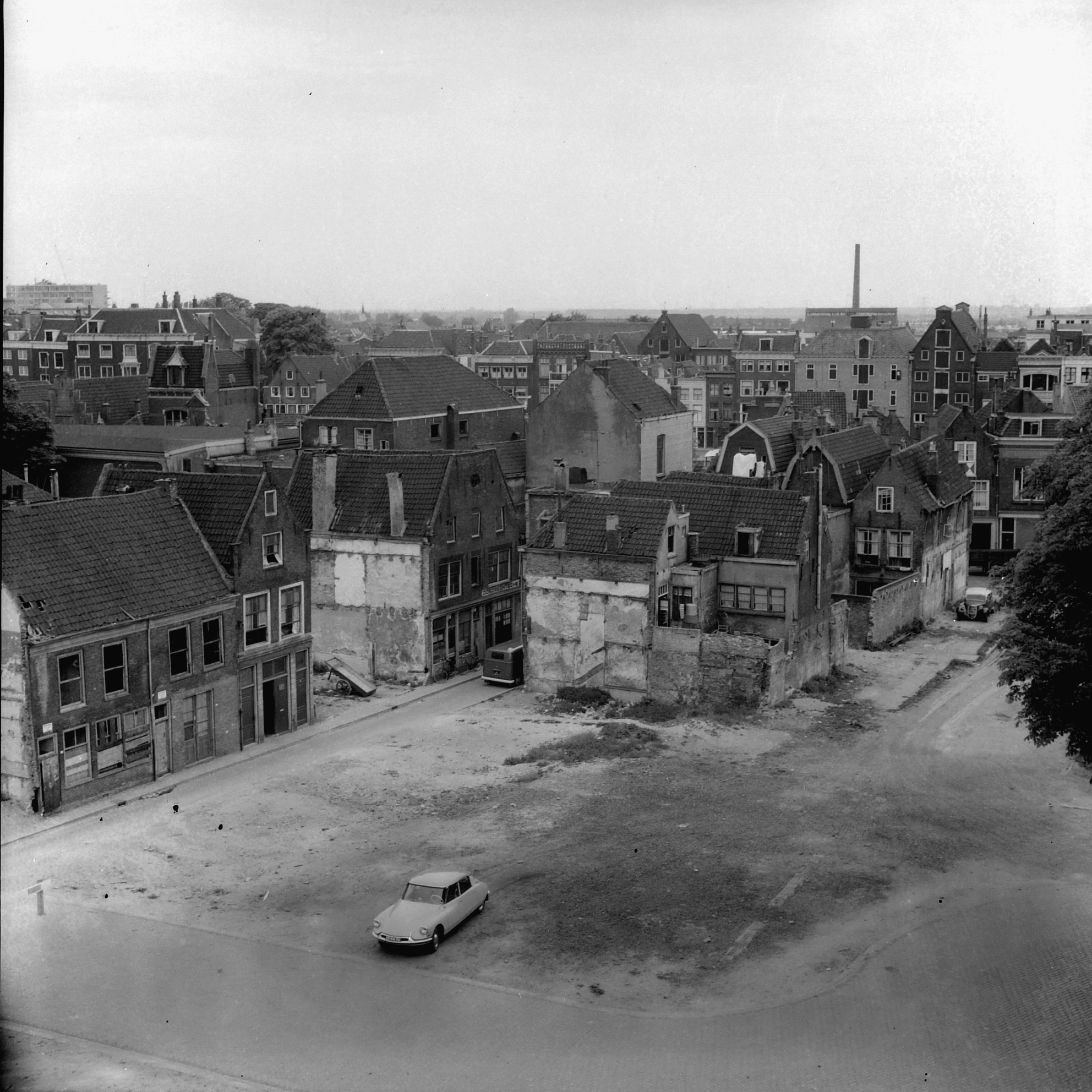 Braakliggend terrein voor de inrichting van de Grote Markt. Links de Tolbrugstraat …