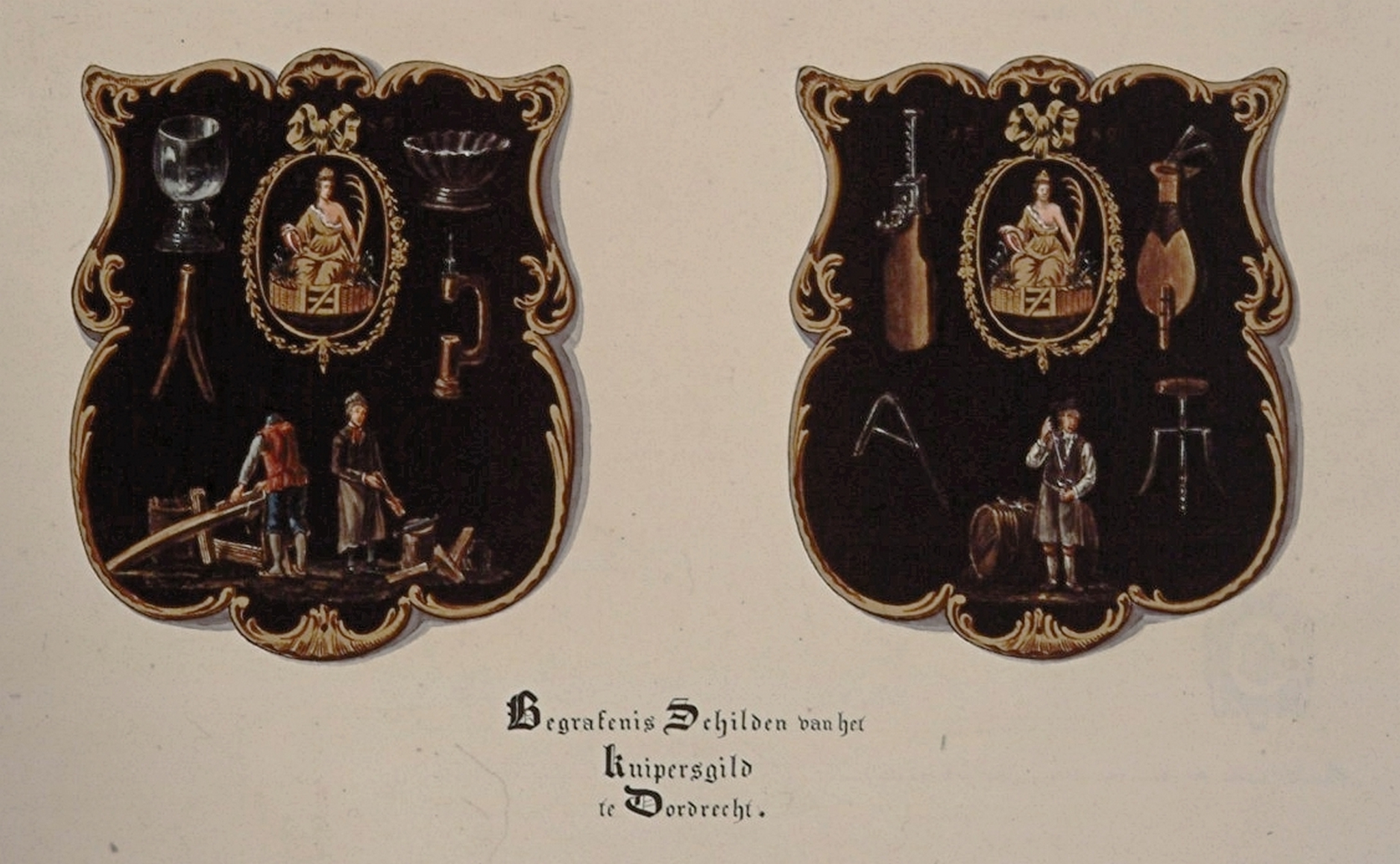 - Begrafenisschilden van het Het Kuipers- of St. Ewouts-gild. te Dordrecht; beschilderd met: de attributen en werktuigen van het gilde, de Dordtsche Maagd en jaartal 1789.
