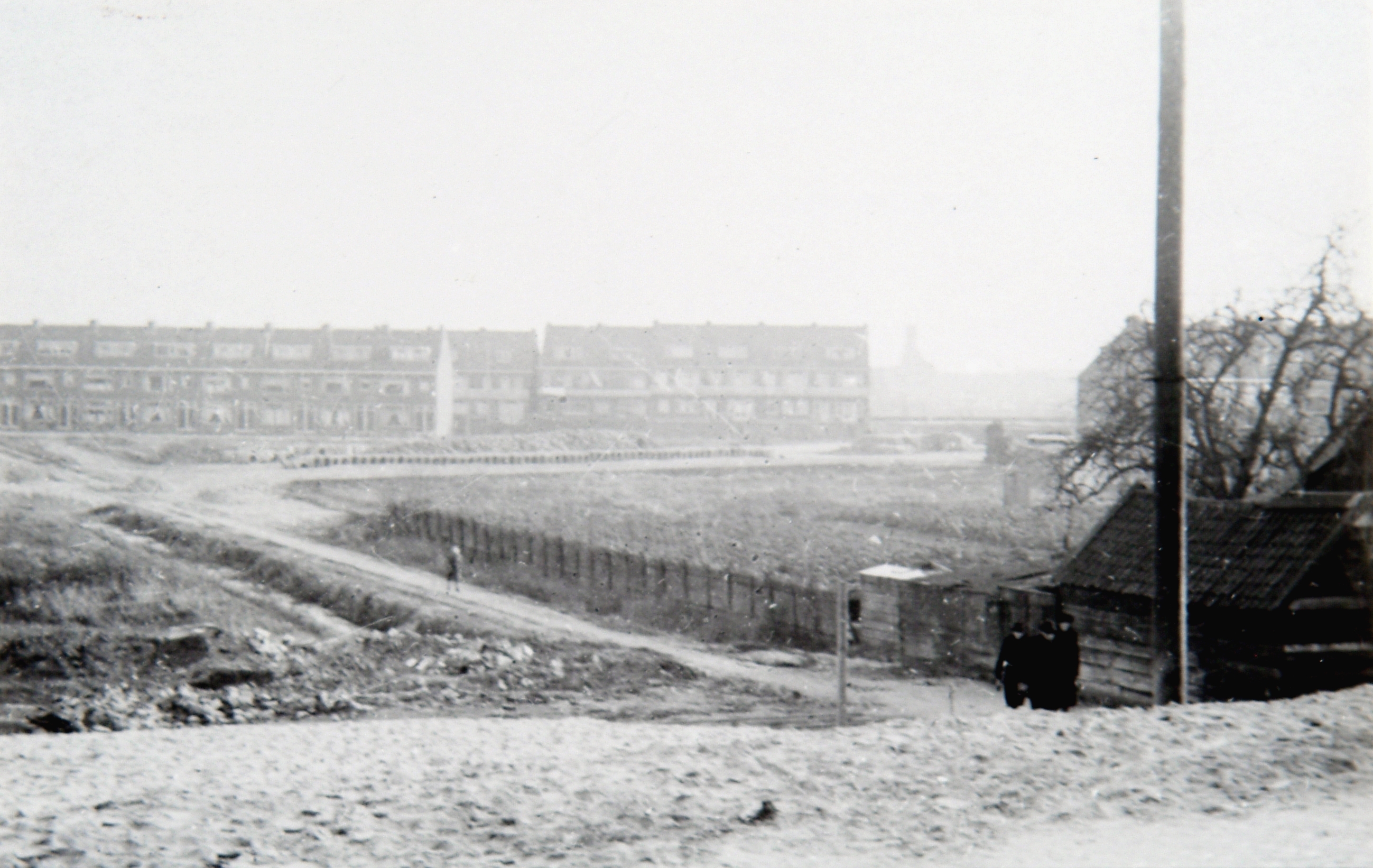 Op de achtergrond niet de Vlietweg. Die komt later vooraan te liggen tegen de dijk aan. De huizen er achter zijn de huizen aan de Heinsiusstraat (vanaf links)en daar weer achter de huizen aan de Hugo de Grootlaan!In feite kijken we naar een "opengewerkte Erasmuslaan" de huizen rechts staan daar al.
